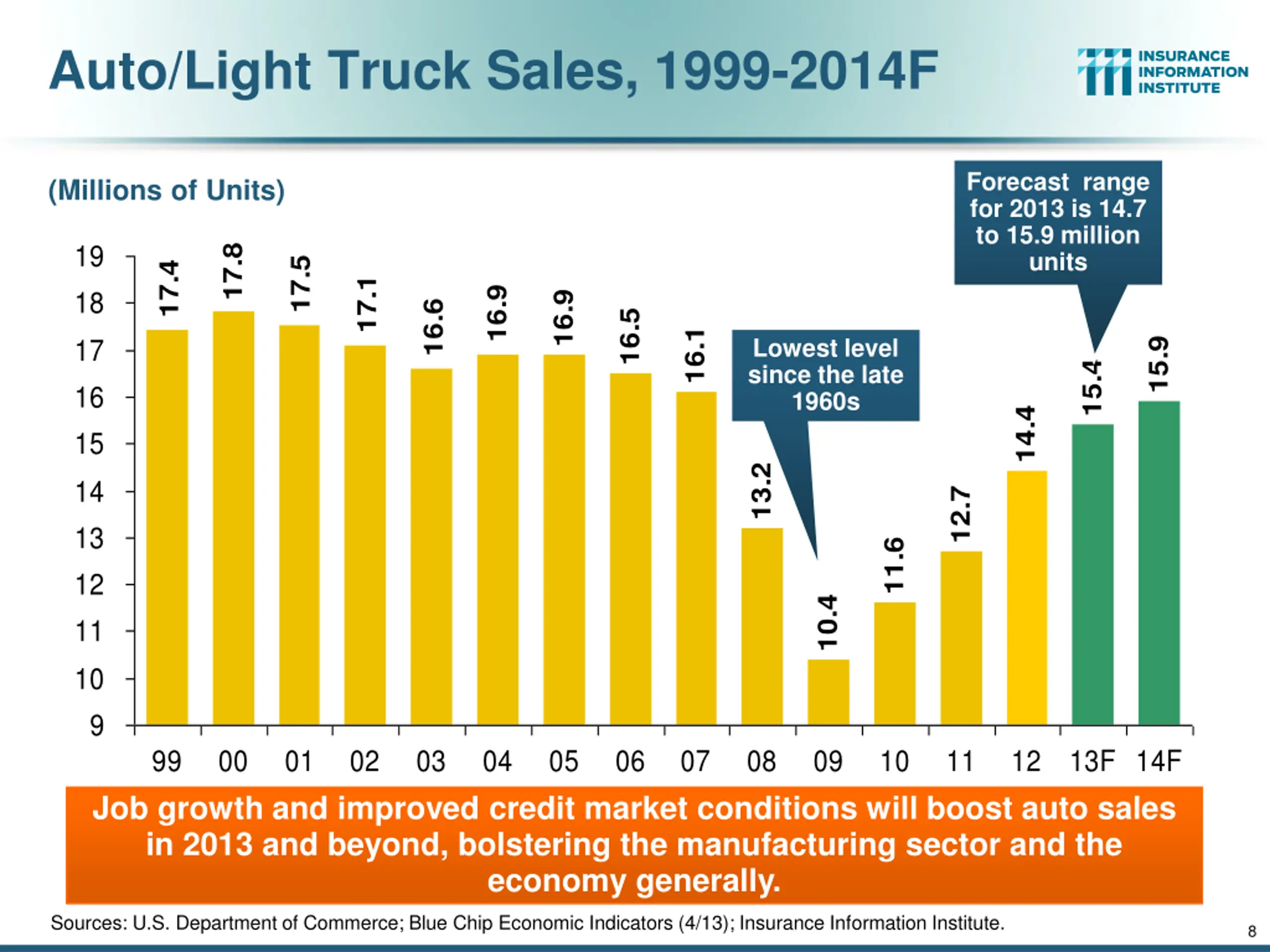 Auto/Light Truck Sales, 1999-2014F Forecast range for 2013 is 14.7 to 15.9 million units (Millions of Units) 19 17.8 17.5 17.4 17.1 16.9 18 16.9 16.6 16.5 16.1 17 Lowest level since the late 1960s 15.9 15.4 16 14.4 15 13.2 14 12.7 13 11.6 12 10.4 11 10 9 99 00 01 02 03 04 05 06 07 08 09 10 11 12 13F 14F Job growth and improved credit market conditions will boost auto sales in 2013 and beyond, bolstering the manufacturing sector and the economy generally. Sources: U.S. Department of Commerce; Blue Chip Economic Indicators (4/13); Insurance Information Institute. 8