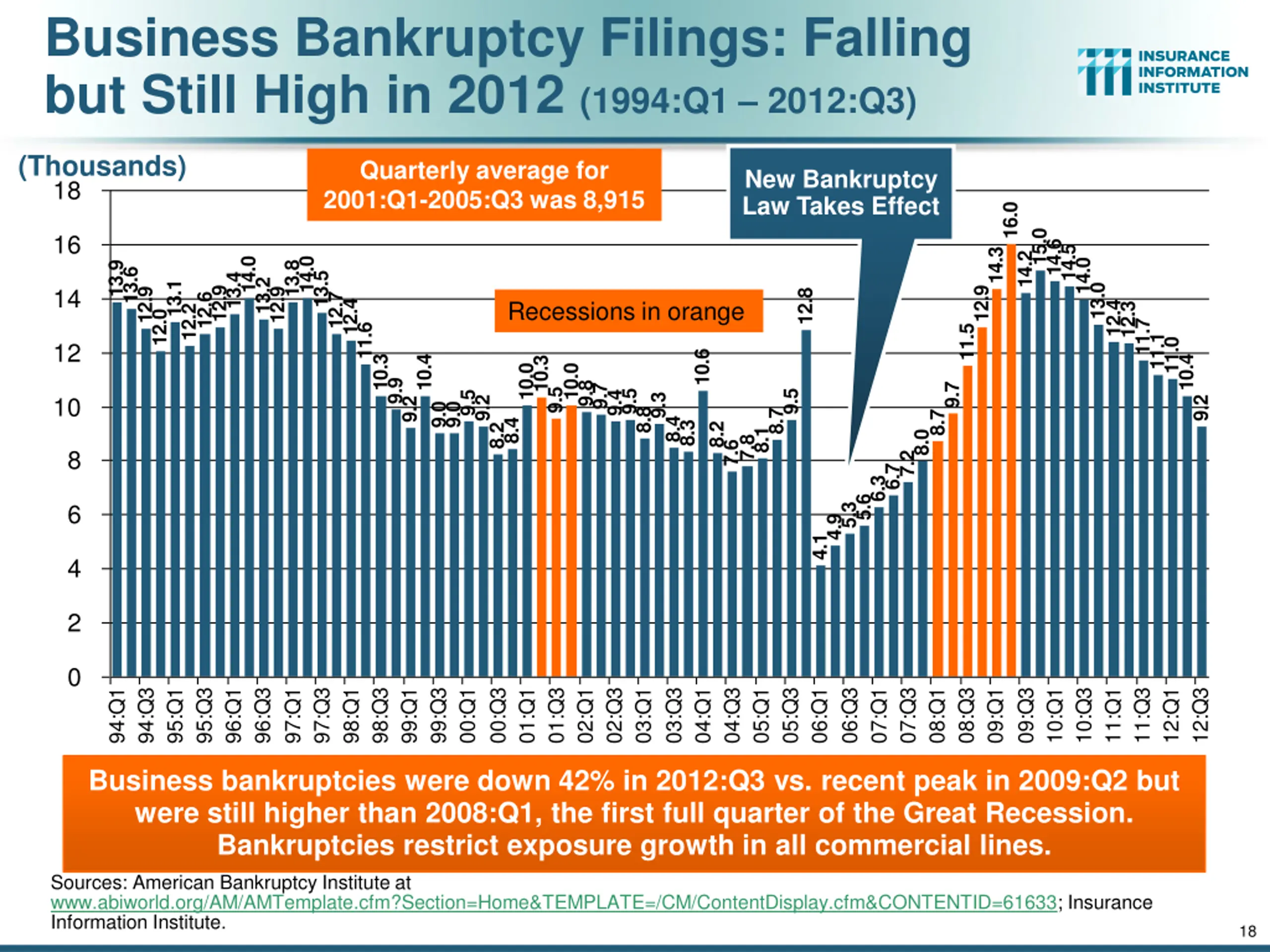 Business Bankruptcy Filings: Falling but Still High in 2012 (1994:Q1 2012:Q3) (Thousands) Quarterly average for 2001:Q1-2005:Q3 was 8,915 New Bankruptcy Law Takes Effect 18 11.512.914.316.0 15.0 16 14.6 14.5 14.2 14.0 14.0 14.0 13.9 13.8 13.6 13.5 13.4 13.2 12.013.1 13.0 14 12.9 12.9 12.9 12.8 12.6 12.7 Recessions in orange 12.4 12.4 12.3 12.2 11.7 11.6 11.1 11.0 12 10.6 10.3 9.210.4 10.4 10.3 10.0 10.0 9.9 9.8 7.28.08.79.7 9.7 9.5 9.5 8.18.79.5 9.5 9.4 9.3 10 9.2 9.2 9.0 9.0 8.8 8.4 8.4 8.3 8.2 8.2 7.8 7.6 8 6.7 5.66.3 6 5.3 4.14.9 4 2 0 94:Q1 94:Q3 95:Q1 95:Q3 96:Q1 96:Q3 97:Q1 97:Q3 98:Q1 98:Q3 99:Q1 99:Q3 00:Q1 00:Q3 01:Q1 01:Q3 02:Q1 02:Q3 03:Q1 03:Q3 04:Q1 04:Q3 05:Q1 05:Q3 06:Q1 06:Q3 07:Q1 07:Q3 08:Q1 08:Q3 09:Q1 09:Q3 10:Q1 10:Q3 11:Q1 11:Q3 12:Q1 12:Q3 Business bankruptcies were down 42% in 2012:Q3 vs. recent peak in 2009:Q2 but were still higher than 2008:Q1, the first full quarter of the Great Recession. Bankruptcies restrict exposure growth in all commercial lines. Sources: American Bankruptcy Institute at www.abiworld.org/AM/AMTemplate.cfm?Section=Home&TEMPLATE=/CM/ContentDisplay.cfm&CONTENTID=61633; Insurance Information Institute. 18