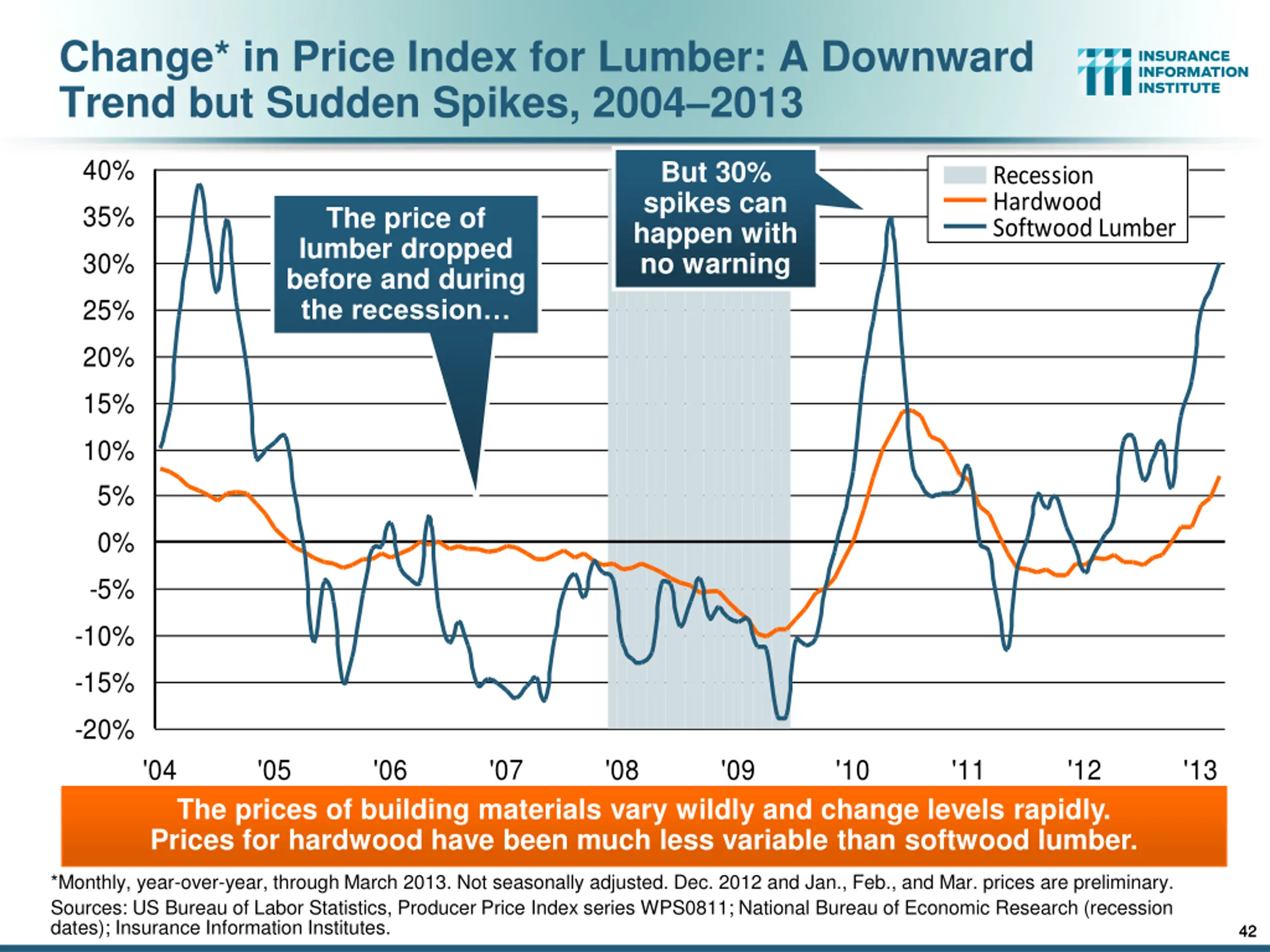 Change* in Price Index for Lumber: A Downward Trend but Sudden Spikes, 2004 2013 40% But 30% spikes can happen with no warning Recession Hardwood Softwood Lumber 35% The price of lumber dropped before and during the recession 30% 25% 20% 15% 10% 5% 0% -5% -10% -15% -20% '04 '05 '06 '07 '08 '09 '10 '11 '12 '13 The prices of building materials vary wildly and change levels rapidly. Prices for hardwood have been much less variable than softwood lumber. *Monthly, year-over-year, through March 2013. Not seasonally adjusted. Dec. 2012 and Jan., Feb., and Mar. prices are preliminary. Sources: US Bureau of Labor Statistics, Producer Price Index series WPS0811; National Bureau of Economic Research (recession dates); Insurance Information Institutes. 42 42