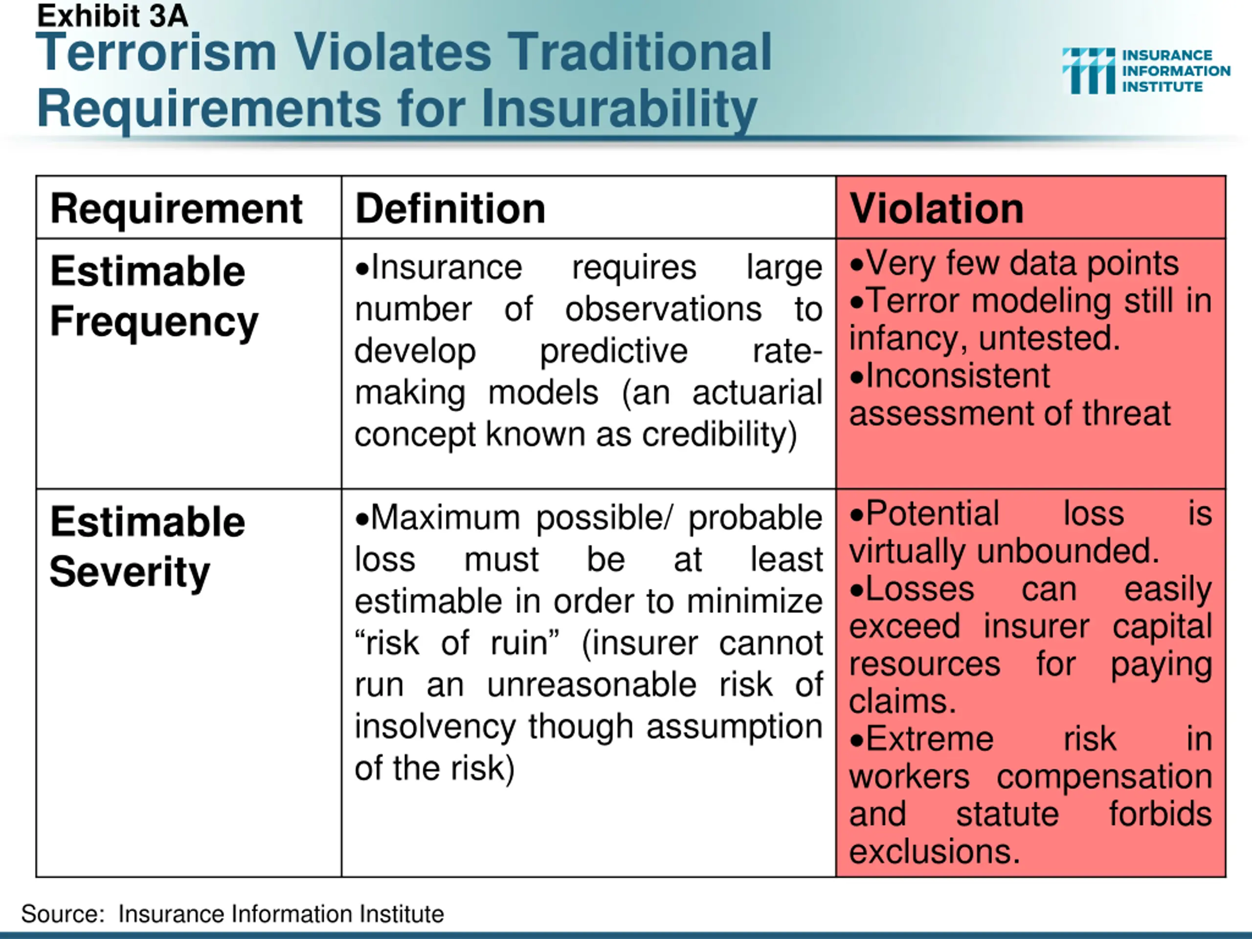 Exhibit 3A Terrorism Violates Traditional Requirements for Insurability Requirement Estimable Frequency Definition Insurance number of observations to develop predictive making models (an actuarial concept known as credibility) Violation Very few data points Terror modeling still in infancy, untested. Inconsistent assessment of threat requires large rate- Potential virtually unbounded. Losses exceed insurer capital resources for paying claims. Extreme workers compensation and statute exclusions. loss is Maximum possible/ probable loss must be estimable in order to minimize risk of ruin (insurer cannot run an unreasonable risk of insolvency though assumption of the risk) Estimable Severity at least can easily risk in forbids Source: Insurance Information Institute
