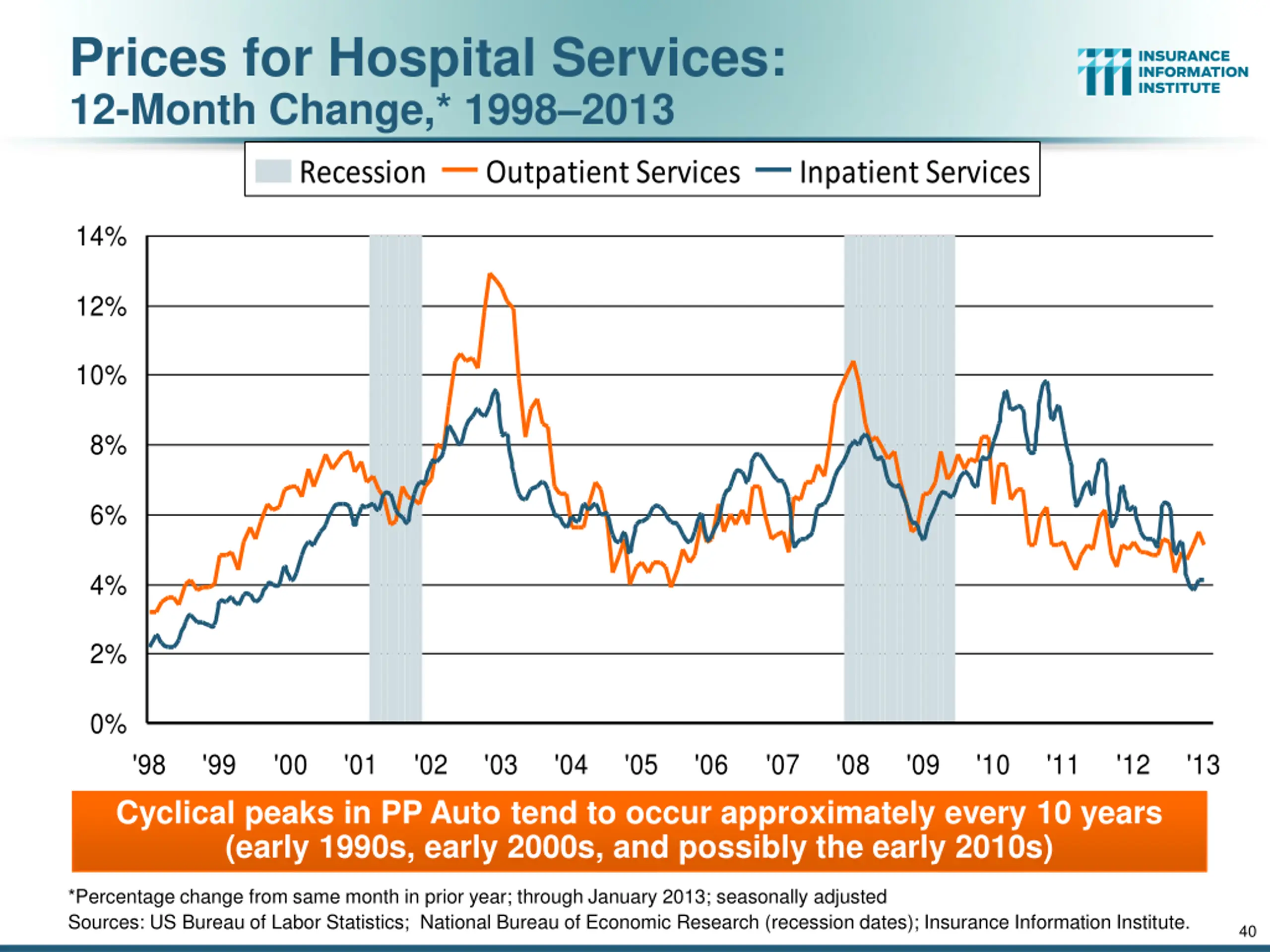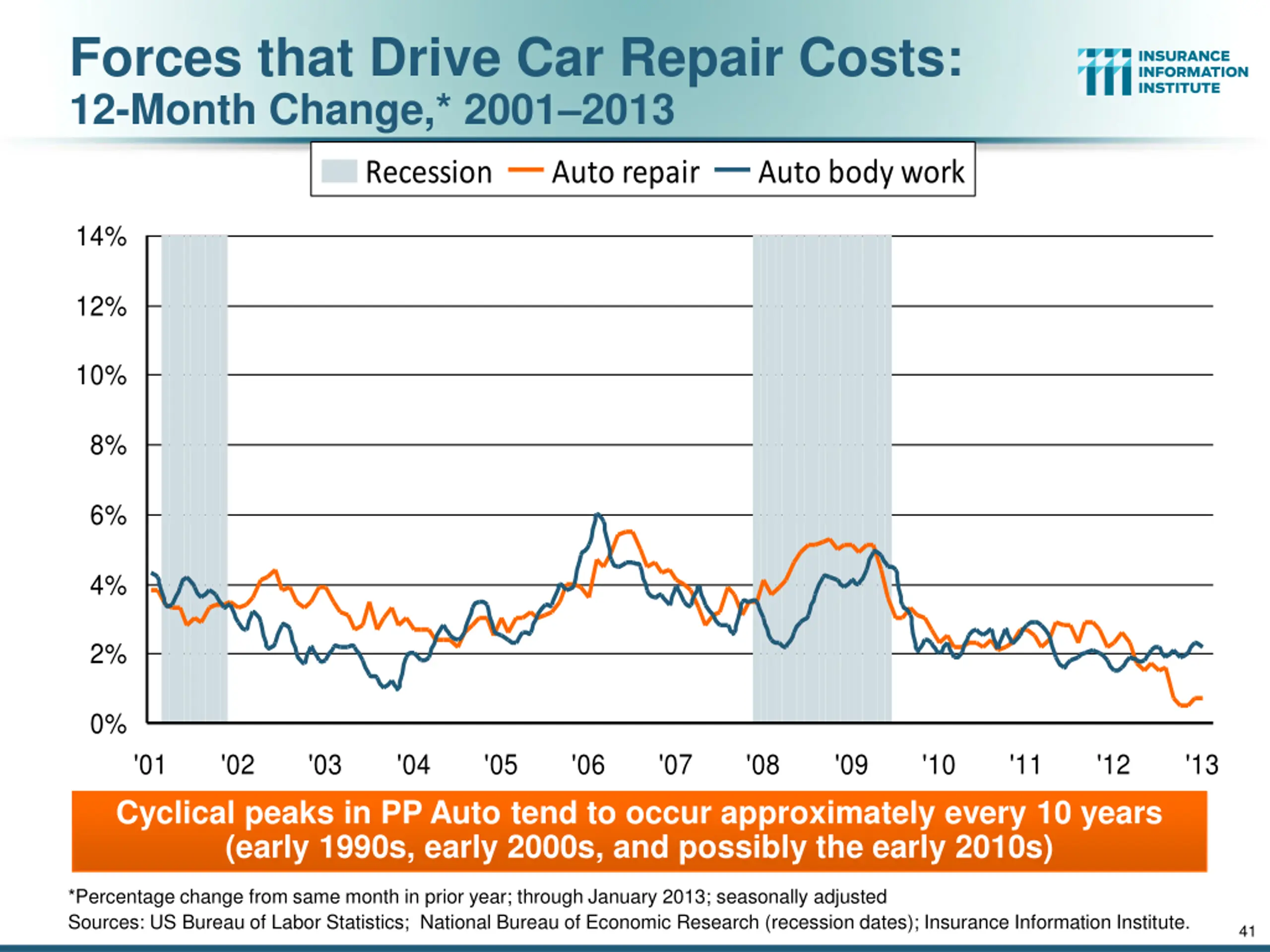 Prices for Hospital Services: 12-Month Change,* 1998 2013 Recession Outpatient Services Inpatient Services 14% 12% 10% 8% 6% 4% 2% 0% '98 Cyclical peaks in PP Auto tend to occur approximately every 10 years (early 1990s, early 2000s, and possibly the early 2010s) '99 '00 '01 '02 '03 '04 '05 '06 '07 '08 '09 '10 '11 '12 '13 *Percentage change from same month in prior year; through January 2013; seasonally adjusted Sources: US Bureau of Labor Statistics; National Bureau of Economic Research (recession dates); Insurance Information Institute. 40