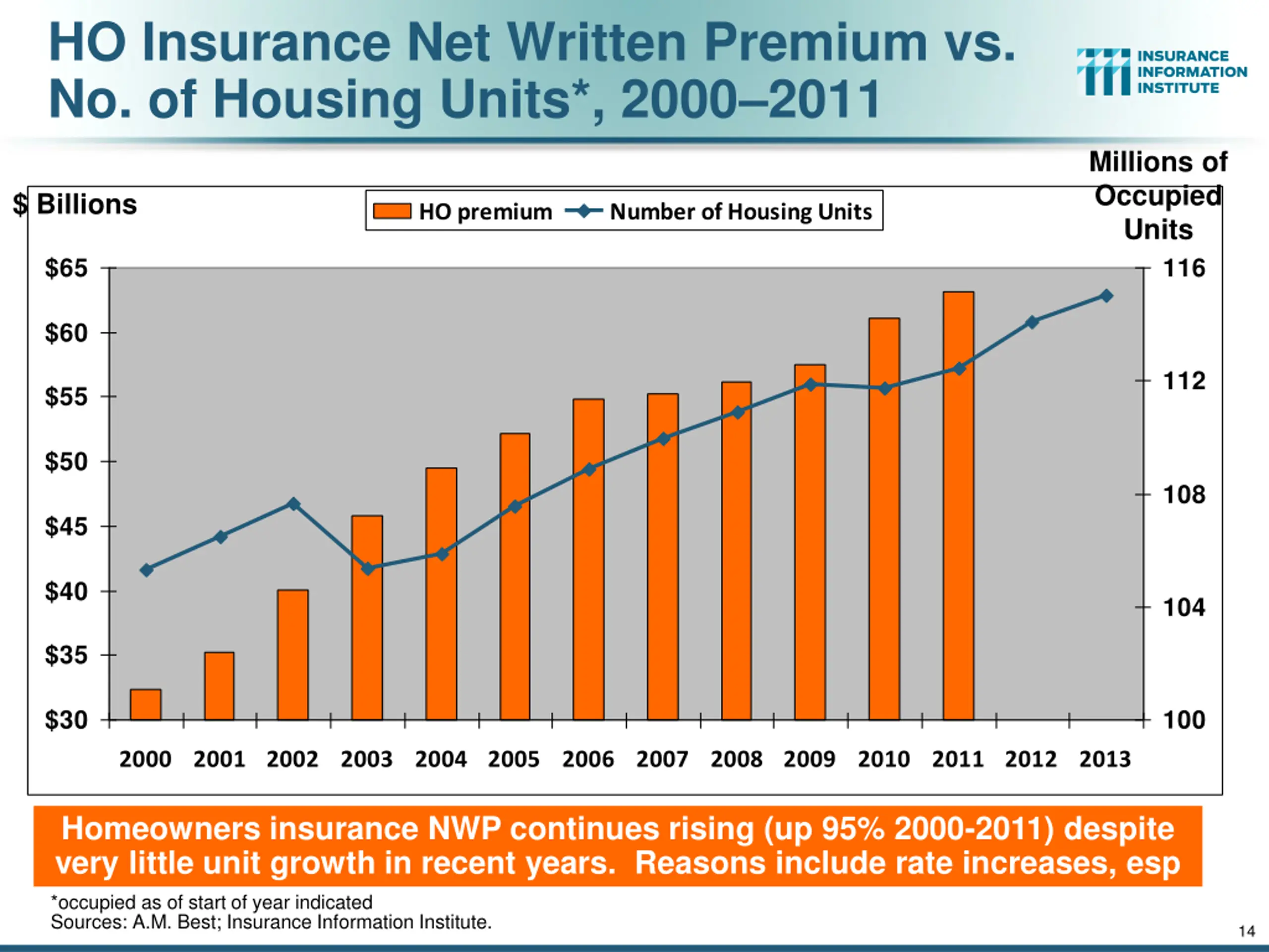 HO Insurance Net Written Premium vs. No. of Housing Units*, 2000 2011 Millions of Occupied Units $ Billions HO premium Number of Housing Units $65 116 $60 112 $55 $50 108 $45 $40 104 $35 $30 100 2000 2001 2002 2003 2004 2005 2006 2007 2008 2009 2010 2011 2012 2013 Homeowners insurance NWP continues rising (up 95% 2000-2011) despite very little unit growth in recent years. Reasons include rate increases, esp *occupied as of start of year indicated Sources: A.M. Best; Insurance Information Institute. 14
