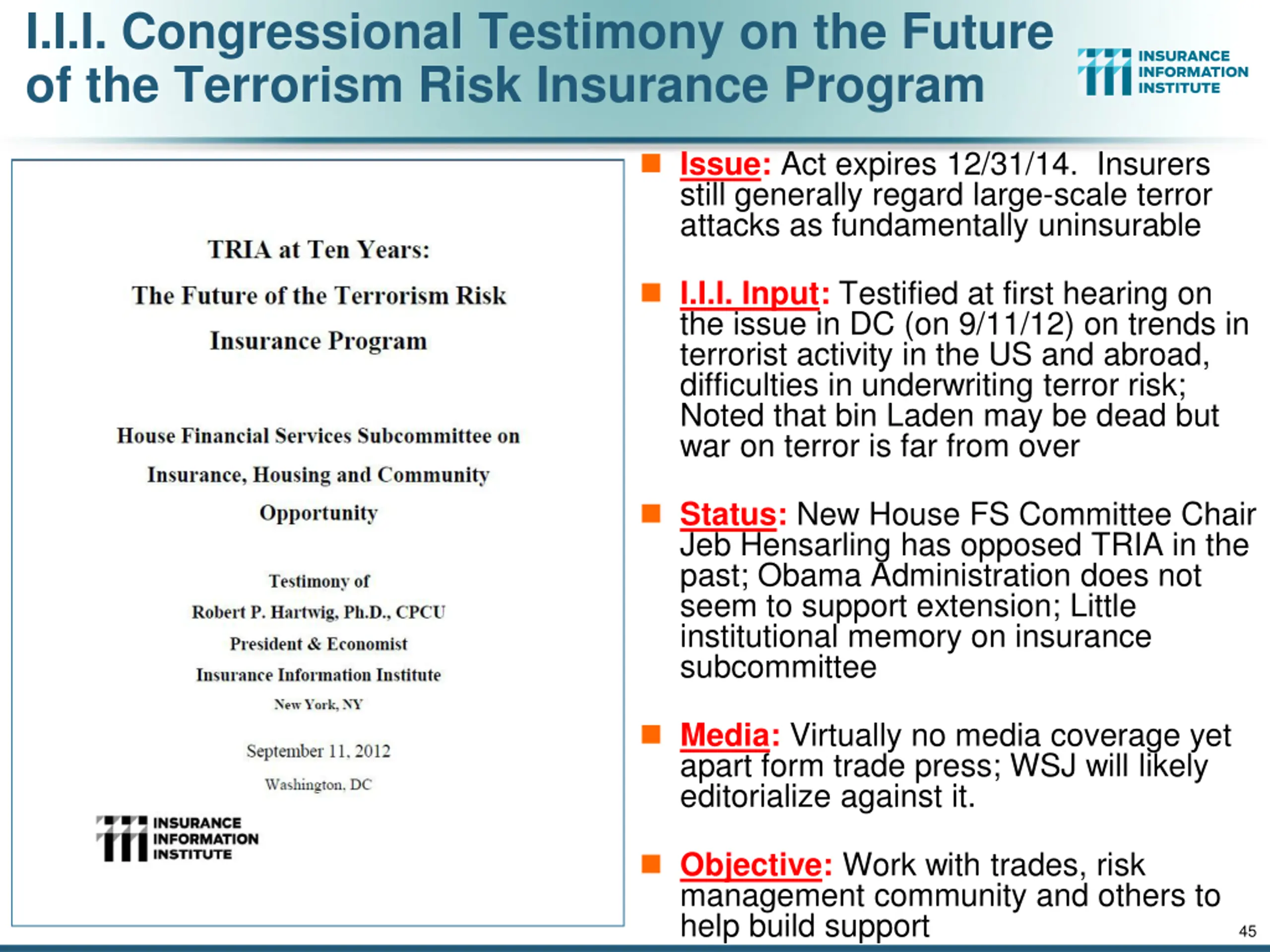 I.I.I. Congressional Testimony on the Future of the Terrorism Risk Insurance Program Issue: Act expires 12/31/14. Insurers still generally regard large-scale terror attacks as fundamentally uninsurable I.I.I. Input: Testified at first hearing on the issue in DC (on 9/11/12) on trends in terrorist activity in the US and abroad, difficulties in underwriting terror risk; Noted that bin Laden may be dead but war on terror is far from over Status: New House FS Committee Chair Jeb Hensarling has opposed TRIA in the past; Obama Administration does not seem to support extension; Little institutional memory on insurance subcommittee Media: Virtually no media coverage yet apart form trade press; WSJ will likely editorialize against it. Objective: Work with trades, risk management community and others to help build support 45