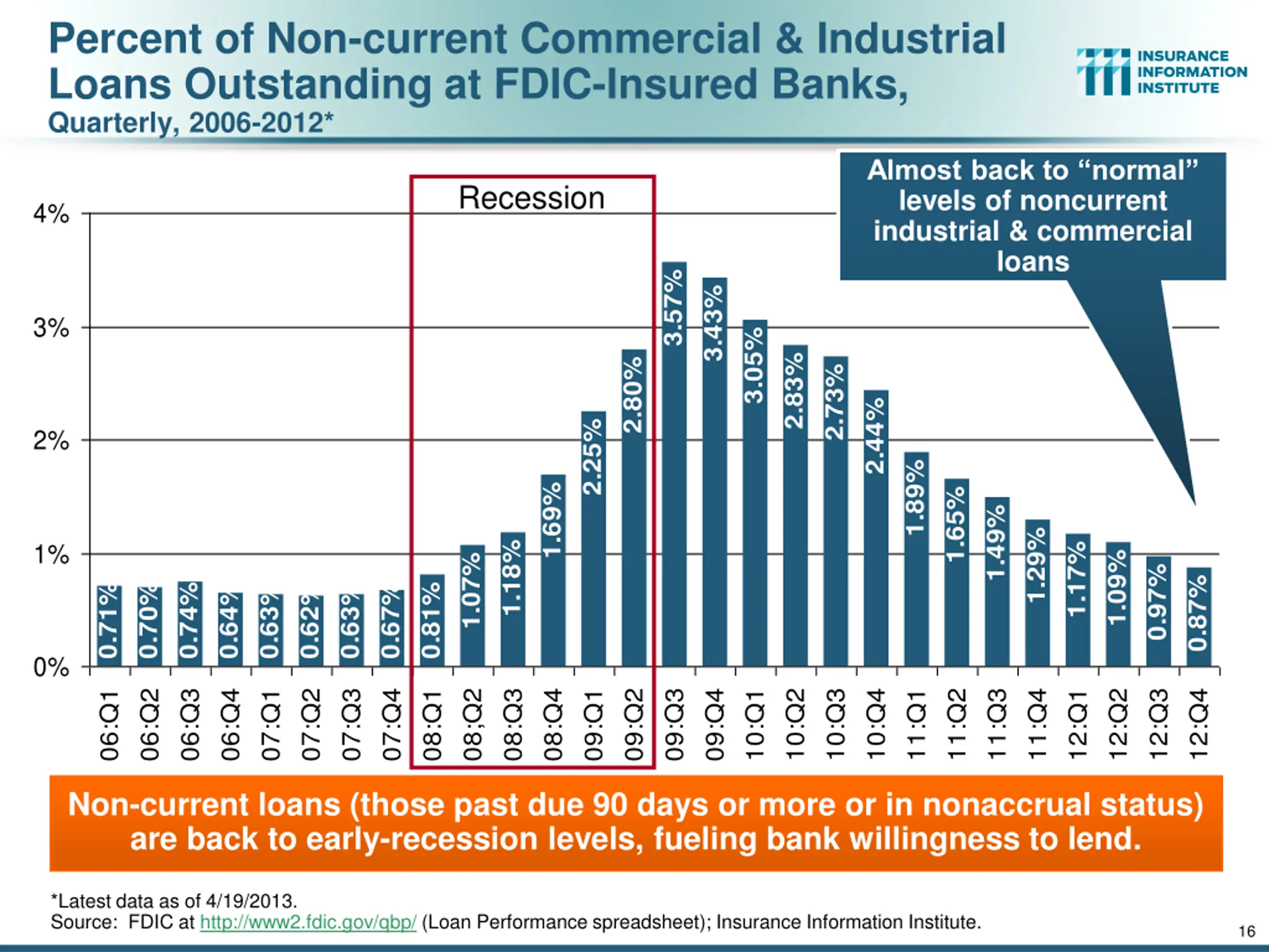 Commercial & Industrial Loans Outstanding at FDIC-Insured Banks, Quarterly, 2006-2012* $Trillions In nominal dollar terms, this is an all-time high. Recession $1.6 $1.5 $1.51 $1.50 $1.49 $1.49 $1.48 $1.46 $1.44 $1.43 $1.4 $1.42 $1.39 $1.37 $1.37 $1.35 $1.3 $1.30 $1.28 $1.27 $1.25 $1.24 $1.2 $1.22 $1.21 $1.20 $1.18 $1.18 $1.18 $1.17 $1.17 $1.16 $1.1 $1.13 $1.0 06:Q1 06:Q3 07:Q1 07:Q3 08:Q1 08:Q3 09:Q1 09:Q3 10:Q1 10:Q3 11:Q1 11:Q3 12:Q1 12:Q3 Outstanding loan volume has been growing for over two years and (as of year-end 2012) surpassed previous peak levels. *Latest data as of 4/19/2013. Source: FDIC at http://www2.fdic.gov/qbp/ (Loan Performance spreadsheet); Insurance Information Institute. 15