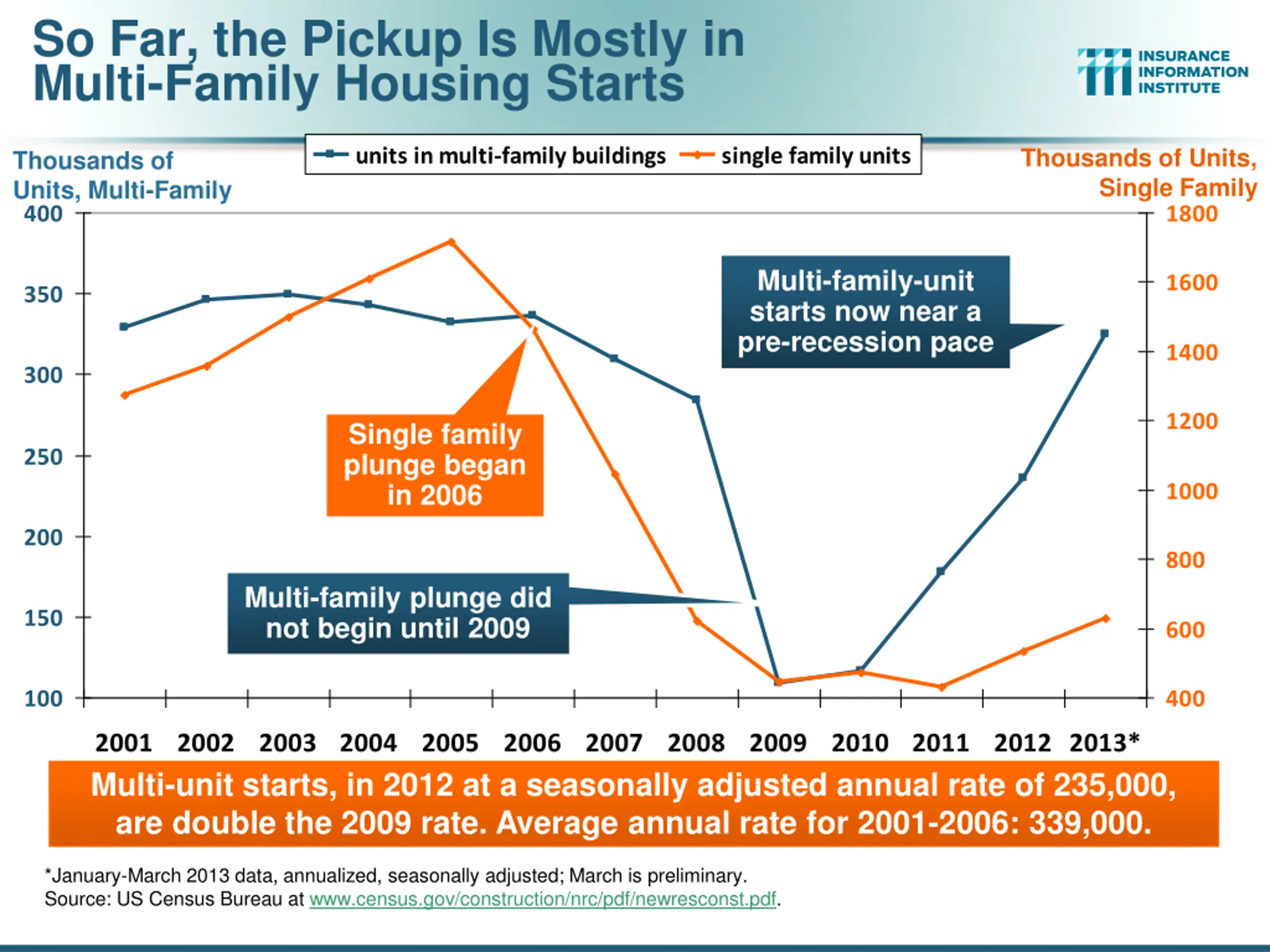 So Far, the Pickup Is Mostly in Multi-Family Housing Starts Thousands of Units, Single Family units in multi-family buildings single family units Thousands of Units, Multi-Family 400 1800 Multi-family-unit starts now near a pre-recession pace 1600 350 1400 300 1200 Single family plunge began in 2006 250 1000 200 800 Multi-family plunge did not begin until 2009 150 600 100 400 2001 2002 2003 2004 2005 2006 2007 2008 2009 2010 2011 2012 2013* Multi-unit starts, in 2012 at a seasonally adjusted annual rate of 235,000, are double the 2009 rate. Average annual rate for 2001-2006: 339,000. *January-March 2013 data, annualized, seasonally adjusted; March is preliminary. Source: US Census Bureau at www.census.gov/construction/nrc/pdf/newresconst.pdf.