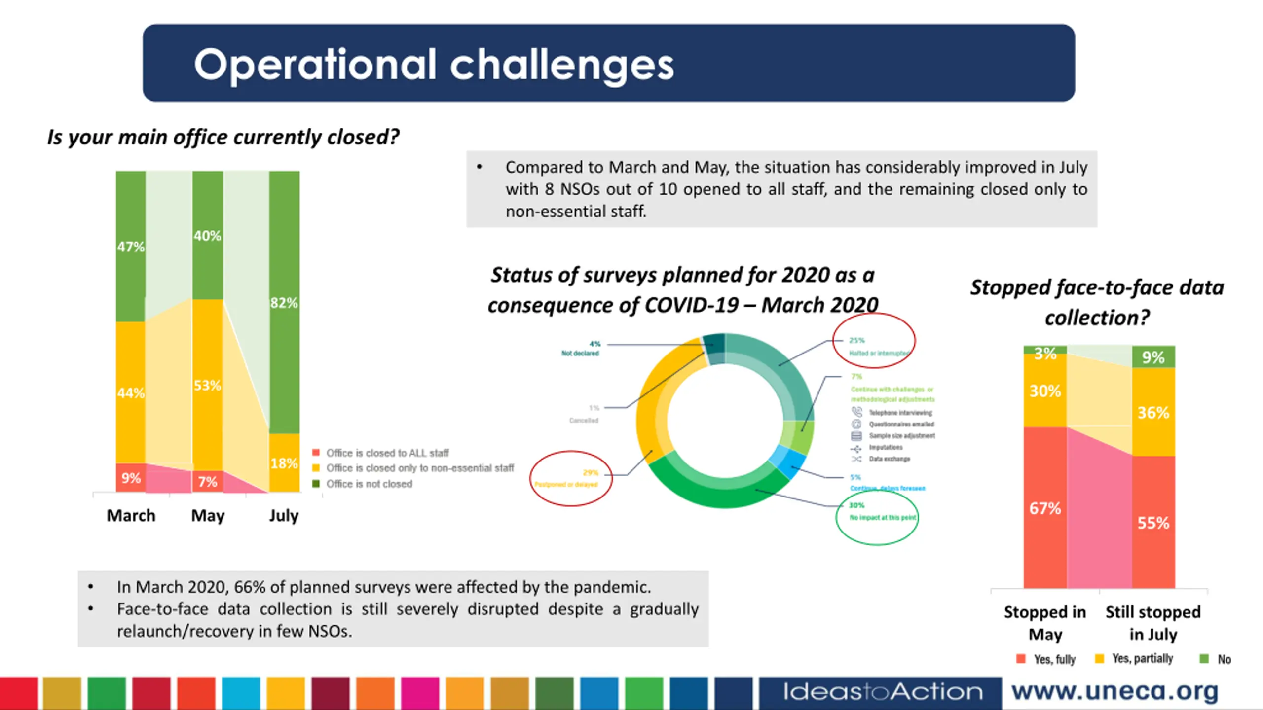 Operational challenges Is your main office currently closed? Compared to March and May, the situation has considerably improved in July with 8 NSOs out of 10 opened to all staff, and the remaining closed only to non-essential staff. 40% 47% Status of surveys planned for 2020 as a consequence of COVID-19 March 2020 Stopped face-to-face data collection? 82% 3% 9% 53% 30% 44% 36% 18% 9% 7% 67% March May July 55% In March 2020, 66% of planned surveys were affected by the pandemic. Face-to-face data collection is still severely disrupted despite a gradually relaunch/recovery in few NSOs. Stopped in May Still stopped in July
