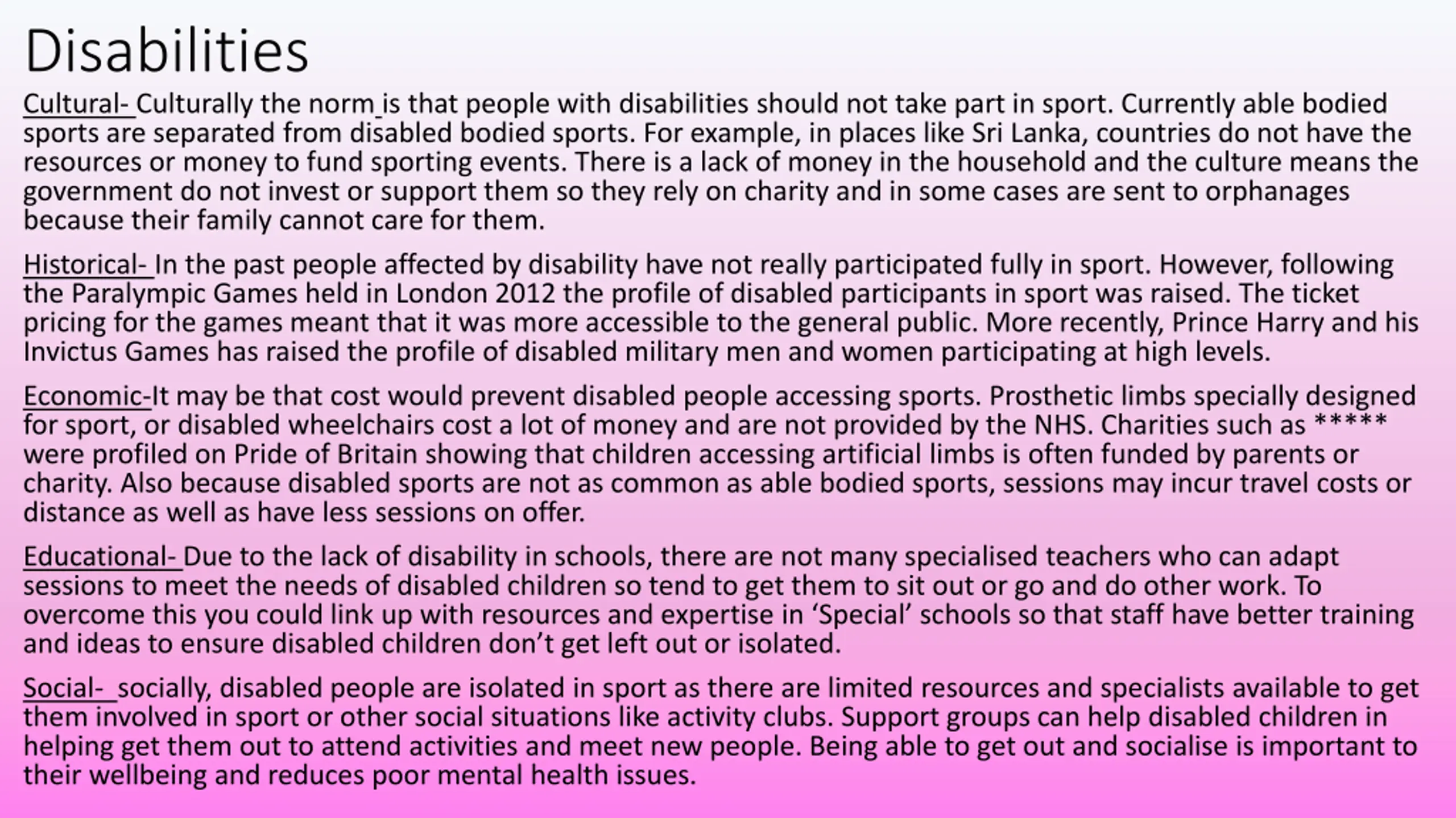 Disabilities Cultural- Culturally the norm is that people with disabilities should not take part in sport. Currently able bodied sports are separated from disabled bodied sports. For example, in places like Sri Lanka, countries do not have the resources or money to fund sporting events. There is a lack of money in the household and the culture means the government do not invest or support them so they rely on charity and in some cases are sent to orphanages because their family cannot care for them. Historical- In the past people affected by disability have not really participated fully in sport. However, following the Paralympic Games held in London 2012 the profile of disabled participants in sport was raised. The ticket pricing for the games meant that it was more accessible to the general public. More recently, Prince Harry and his Invictus Games has raised the profile of disabled military men and women participating at high levels. Economic-It may be that cost would prevent disabled people accessing sports. Prosthetic limbs specially designed for sport, or disabled wheelchairs cost a lot of money and are not provided by the NHS. Charities such as ***** were profiled on Pride of Britain showing that children accessing artificial limbs is often funded by parents or charity. Also because disabled sports are not as common as able bodied sports, sessions may incur travel costs or distance as well as have less sessions on offer. Educational- Due to the lack of disability in schools, there are not many specialised teachers who can adapt sessions to meet the needs of disabled children so tend to get them to sit out or go and do other work. To overcome this you could link up with resources and expertise in Special schools so that staff have better training and ideas to ensure disabled children don t get left out or isolated. Social- socially, disabled people are isolated in sport as there are limited resources and specialists available to get them involved in sport or other social situations like activity clubs. Support groups can help disabled children in helping get them out to attend activities and meet new people. Being able to get out and socialise is important to their wellbeing and reduces poor mental health issues.