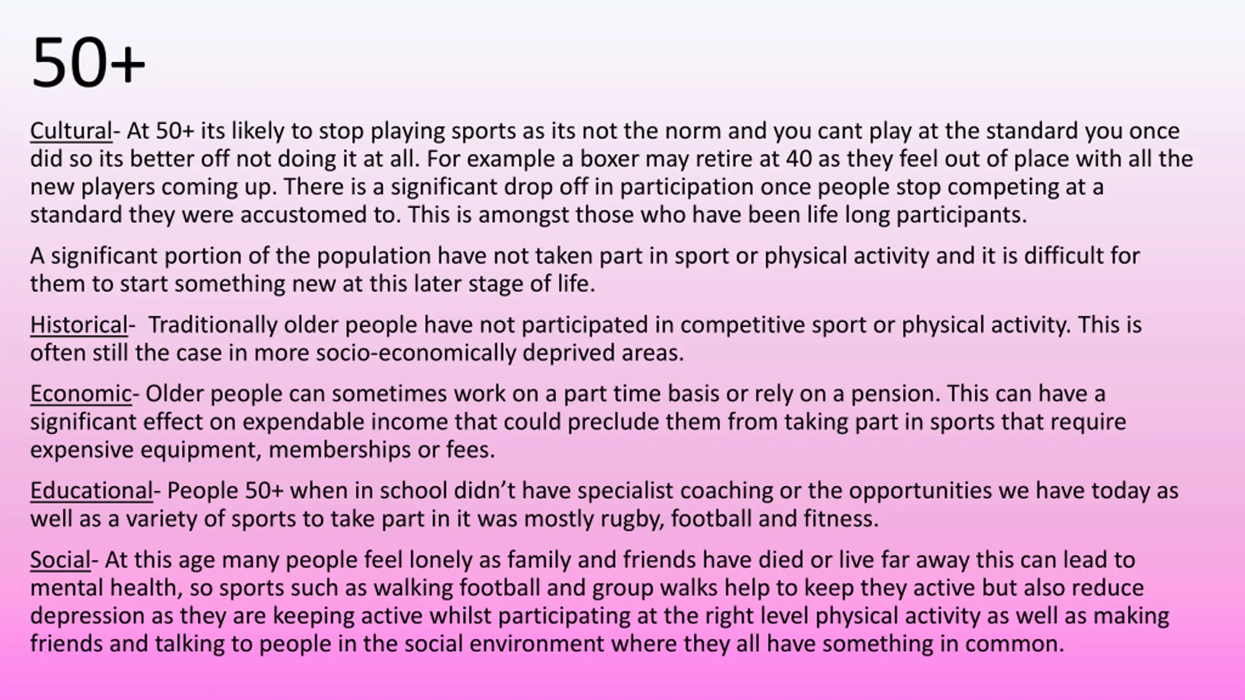 50+ Cultural- At 50+ its likely to stop playing sports as its not the norm and you cant play at the standard you once did so its better off not doing it at all. For example a boxer may retire at 40 as they feel out of place with all the new players coming up. There is a significant drop off in participation once people stop competing at a standard they were accustomed to. This is amongst those who have been life long participants. A significant portion of the population have not taken part in sport or physical activity and it is difficult for them to start something new at this later stage of life. Historical- Traditionally older people have not participated in competitive sport or physical activity. This is often still the case in more socio-economically deprived areas. Economic- Older people can sometimes work on a part time basis or rely on a pension. This can have a significant effect on expendable income that could preclude them from taking part in sports that require expensive equipment, memberships or fees. Educational- People 50+ when in school didn t have specialist coaching or the opportunities we have today as well as a variety of sports to take part in it was mostly rugby, football and fitness. Social- At this age many people feel lonely as family and friends have died or live far away this can lead to mental health, so sports such as walking football and group walks help to keep they active but also reduce depression as they are keeping active whilst participating at the right level physical activity as well as making friends and talking to people in the social environment where they all have something in common.
