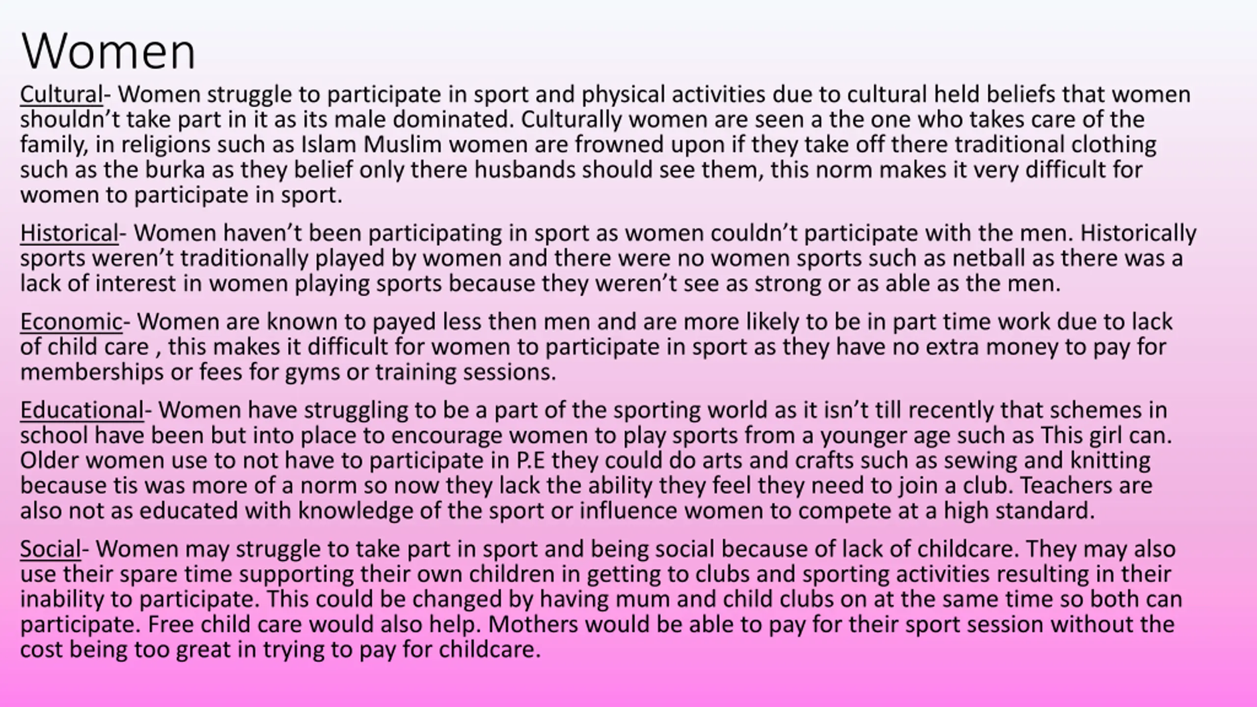 Women Cultural- Women struggle to participate in sport and physical activities due to cultural held beliefs that women shouldn t take part in it as its male dominated. Culturally women are seen a the one who takes care of the family, in religions such as Islam Muslim women are frowned upon if they take off there traditional clothing such as the burka as they belief only there husbands should see them, this norm makes it very difficult for women to participate in sport. Historical- Women haven t been participating in sport as women couldn t participate with the men. Historically sports weren t traditionally played by women and there were no women sports such as netball as there was a lack of interest in women playing sports because they weren t see as strong or as able as the men. Economic- Women are known to payed less then men and are more likely to be in part time work due to lack of child care , this makes it difficult for women to participate in sport as they have no extra money to pay for memberships or fees for gyms or training sessions. Educational- Women have struggling to be a part of the sporting world as it isn t till recently that schemes in school have been but into place to encourage women to play sports from a younger age such as This girl can. Older women use to not have to participate in P.E they could do arts and crafts such as sewing and knitting because tis was more of a norm so now they lack the ability they feel they need to join a club. Teachers are also not as educated with knowledge of the sport or influence women to compete at a high standard. Social- Women may struggle to take part in sport and being social because of lack of childcare. They may also use their spare time supporting their own children in getting to clubs and sporting activities resulting in their inability to participate. This could be changed by having mum and child clubs on at the same time so both can participate.Free child care would also help. Mothers would be able to pay for their sport session without the cost being too great in trying to pay for childcare.