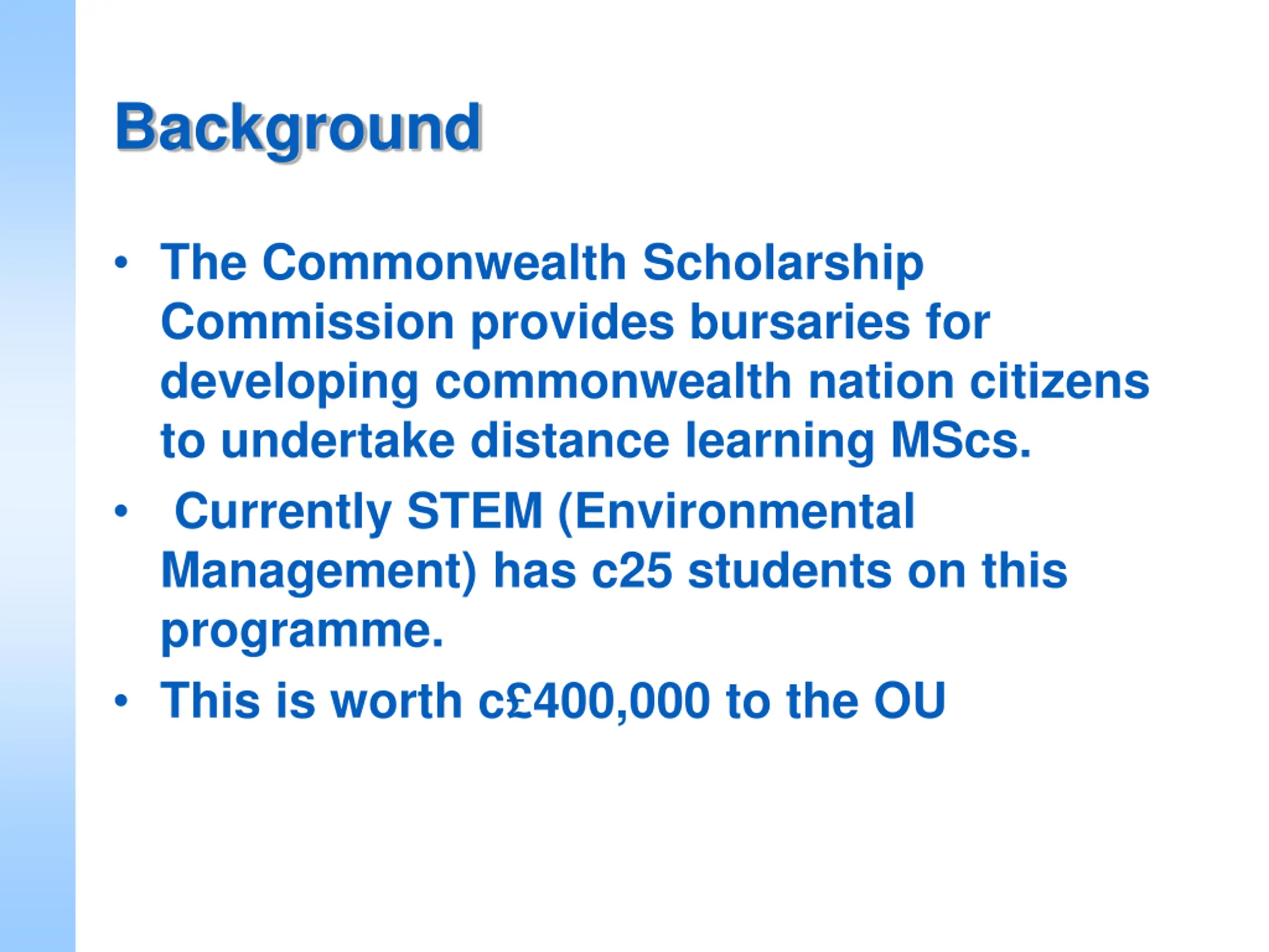 Background The Commonwealth Scholarship Commission provides bursaries for developing commonwealth nation citizens to undertake distance learning MScs. Currently STEM (Environmental Management) has c25 students on this programme. This is worth c 400,000 to the OU