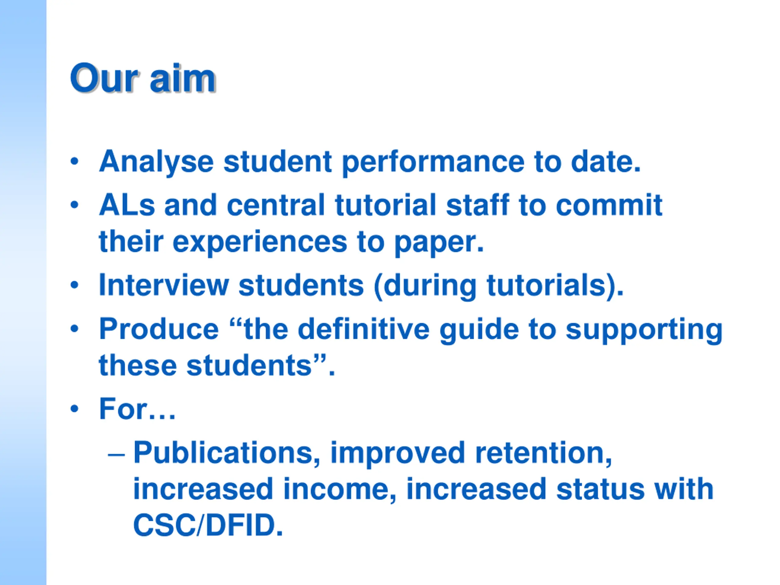 Our aim Analyse student performance to date. ALs and central tutorial staff to commit their experiences to paper. Interview students (during tutorials). Produce the definitive guide to supporting these students . For Publications, improved retention, increased income, increased status with CSC/DFID.