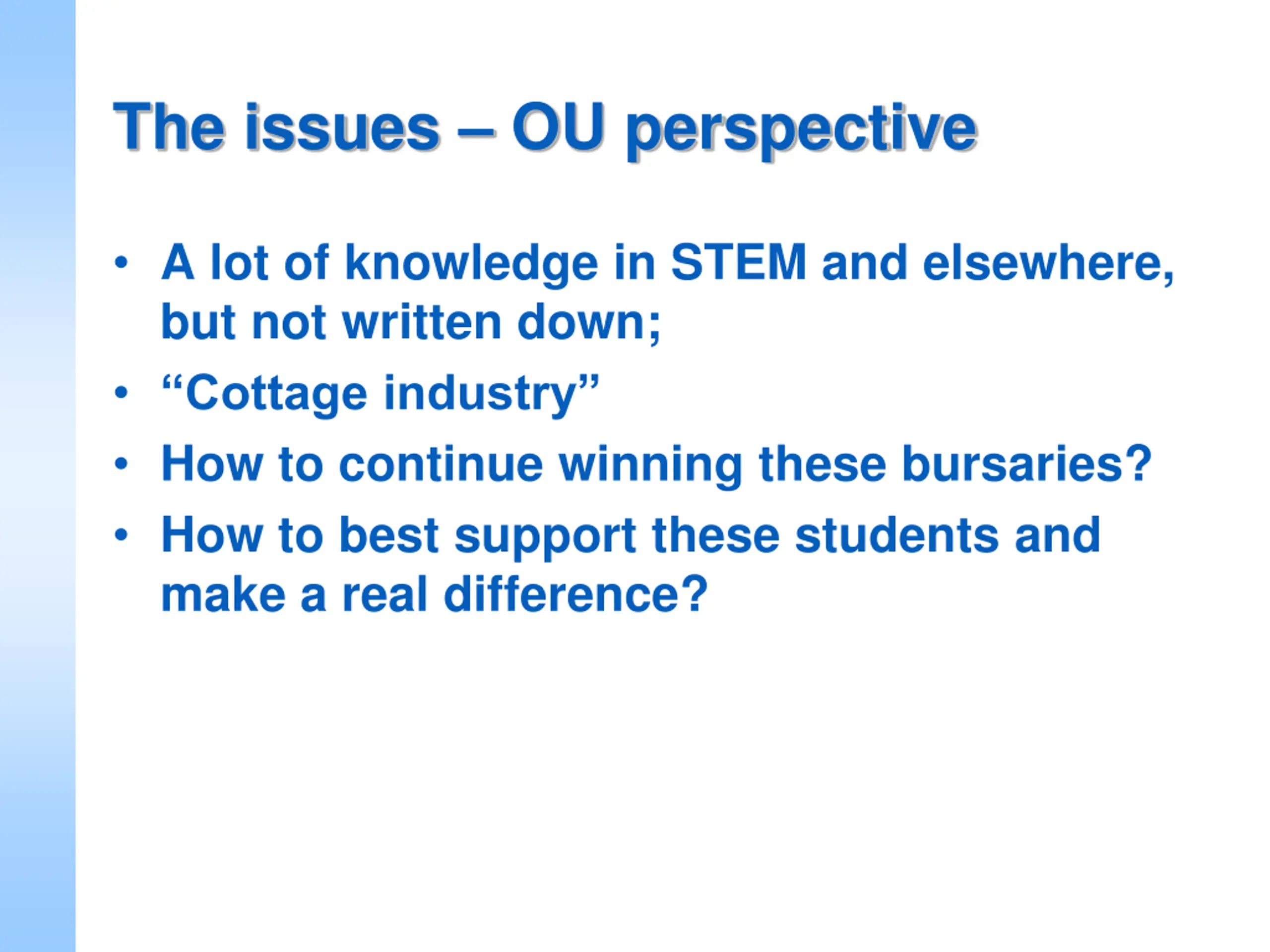 The issues OU perspective A lot of knowledge in STEM and elsewhere, but not written down; Cottage industry How to continue winning these bursaries? How to best support these students and make a real difference?