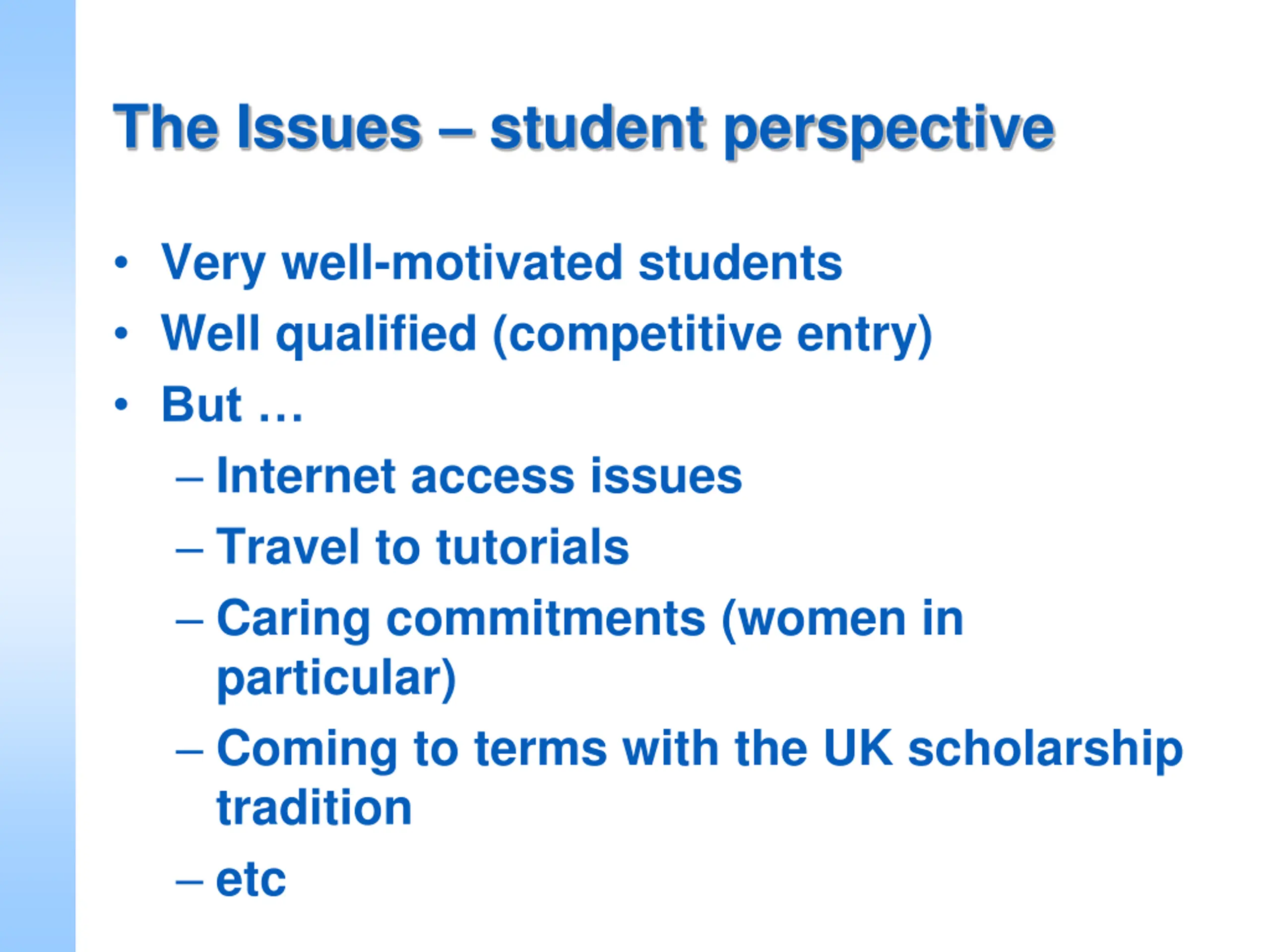 The Issues student perspective Very well-motivated students Well qualified (competitive entry) But Internet access issues Travel to tutorials Caring commitments (women in particular) Coming to terms with the UK scholarship tradition etc