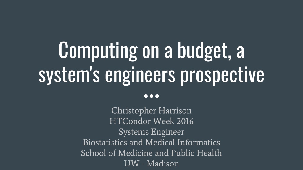 Computing on a budget, a system's engineers prospective Christopher Harrison HTCondor Week 2016 Systems Engineer Biostatistics and Medical Informatics School of Medicine and Public Health UW - Madison