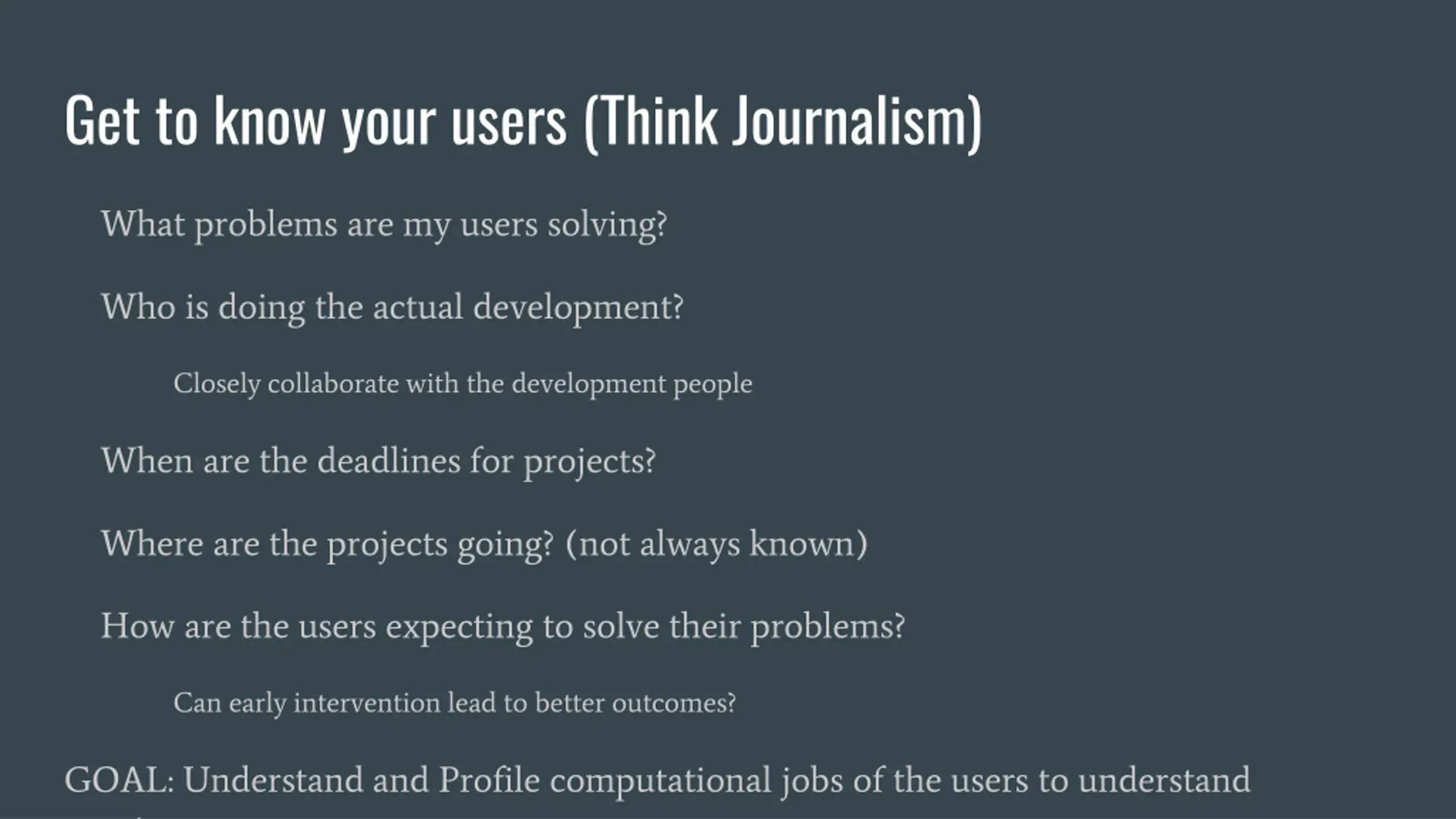 Get to know your users (Think Journalism) What problems are my users solving? Who is doing the actual development? Closely collaborate with the development people When are the deadlines for projects? Where are the projects going? (not always known) How are the users expecting to solve their problems? Can early intervention lead to better outcomes? GOAL: Understand and Profile computational jobs of the users to understand requirements