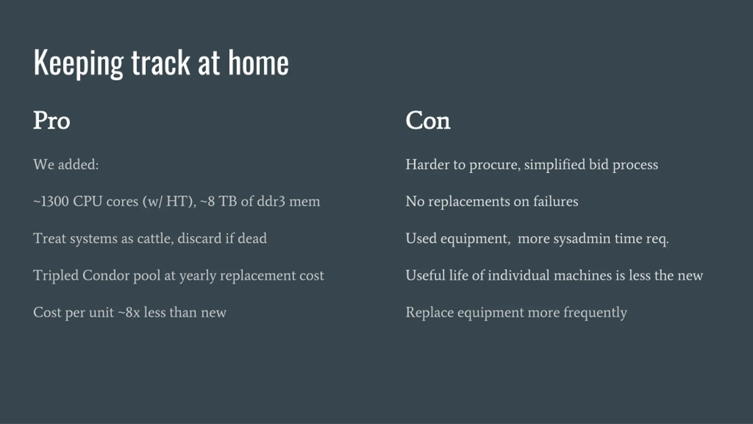 Keeping track at home Pro Pro Con Con We added: Harder to procure, simplified bid process ~1300 CPU cores (w/ HT), ~8 TB of ddr3 mem No replacements on failures Treat systems as cattle, discard if dead Used equipment, more sysadmin time req. Tripled Condor pool at yearly replacement cost Useful life of individual machines is less the new Cost per unit ~8x less than new Replace equipment more frequently