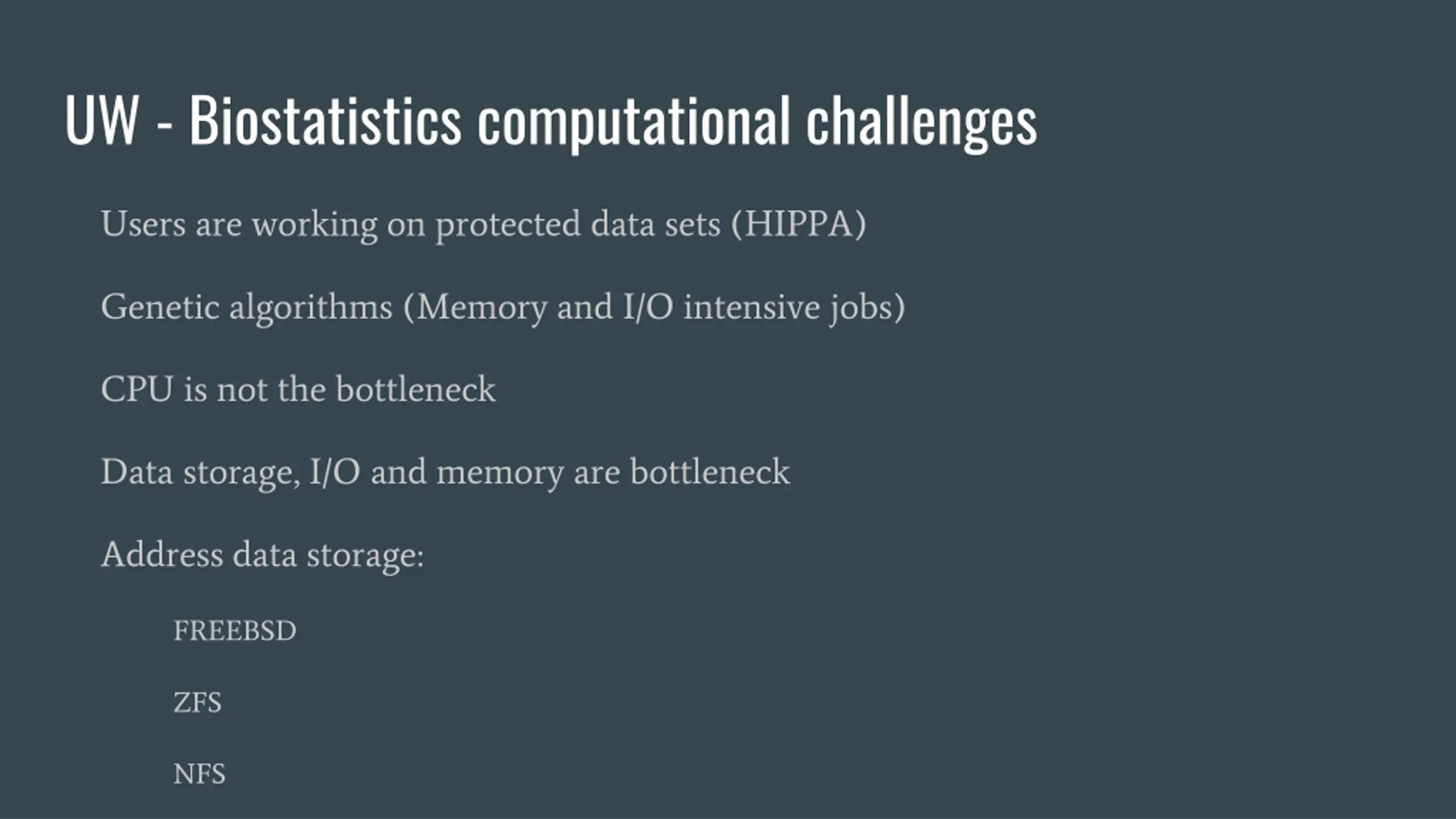 UW - Biostatistics computational challenges Users are working on protected data sets (HIPPA) Genetic algorithms (Memory and I/O intensive jobs) CPU is not the bottleneck Data storage, I/O and memory are bottleneck Address data storage: FREEBSD ZFS NFS