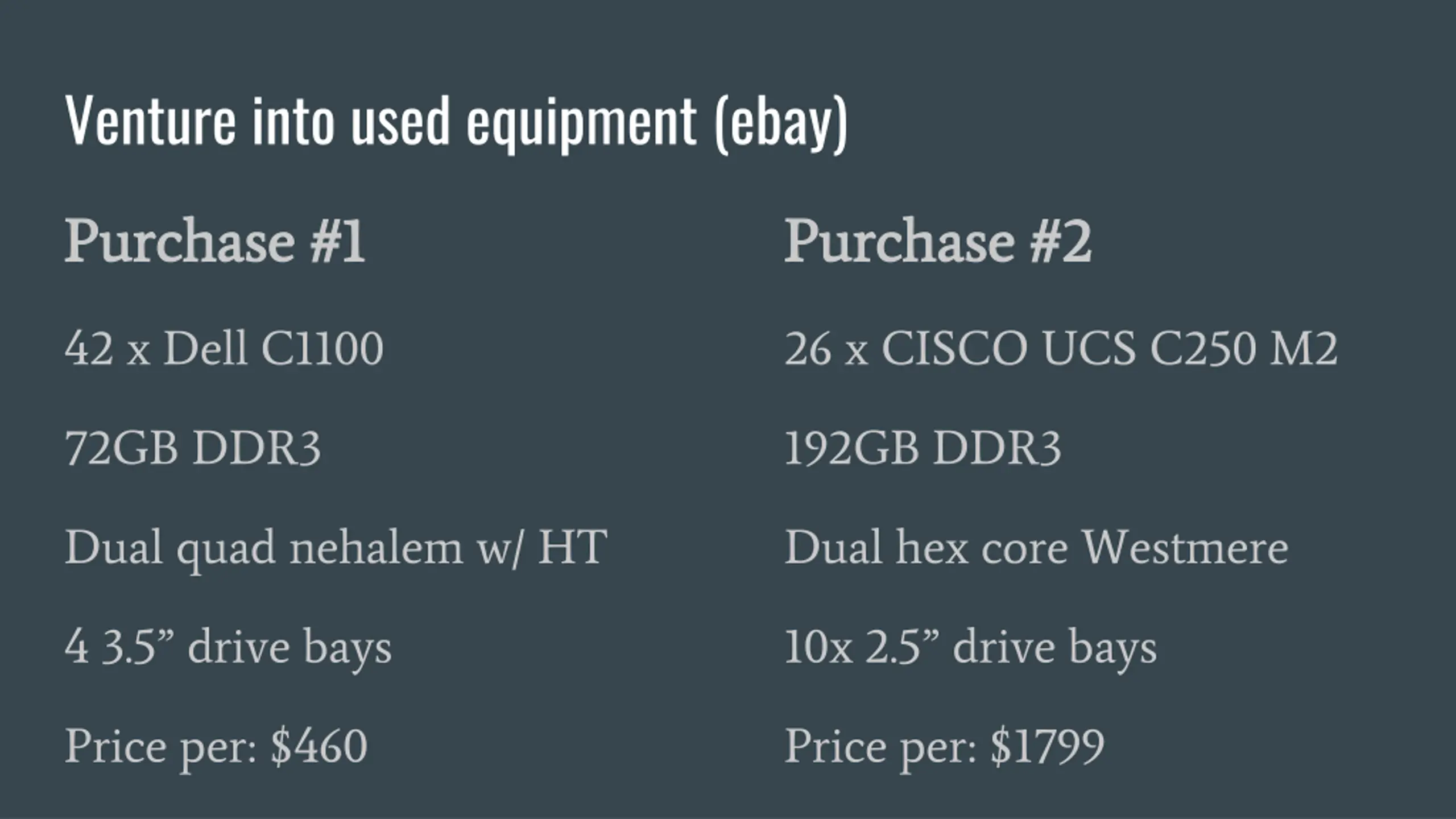 Venture into used equipment (ebay) Purchase #1 Purchase #1 Purchase #2 Purchase #2 42 x Dell C1100 26 x CISCO UCS C250 M2 72GB DDR3 192GB DDR3 Dual quad nehalem w/ HT Dual hex core Westmere 4 3.5 drive bays 10x 2.5 drive bays Price per: $460 Price per: $1799