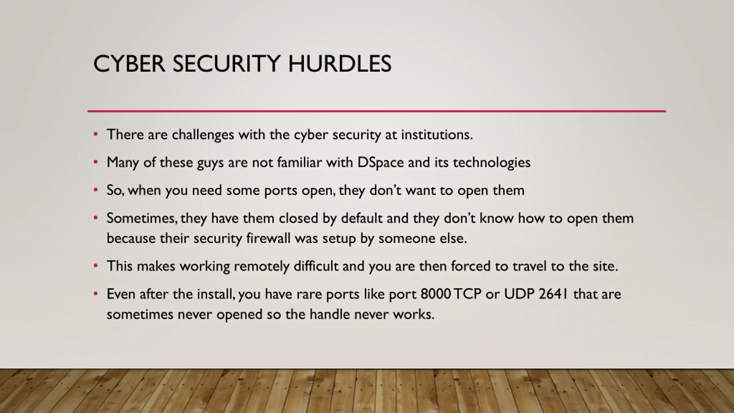 CYBER SECURITY HURDLES There are challenges with the cyber security at institutions. Many of these guys are not familiar with DSpace and its technologies So, when you need some ports open, they don t want to open them Sometimes, they have them closed by default and they don t know how to open them because their security firewall was setup by someone else. This makes working remotely difficult and you are then forced to travel to the site. Even after the install, you have rare ports like port 8000 TCP or UDP 2641 that are sometimes never opened so the handle never works.