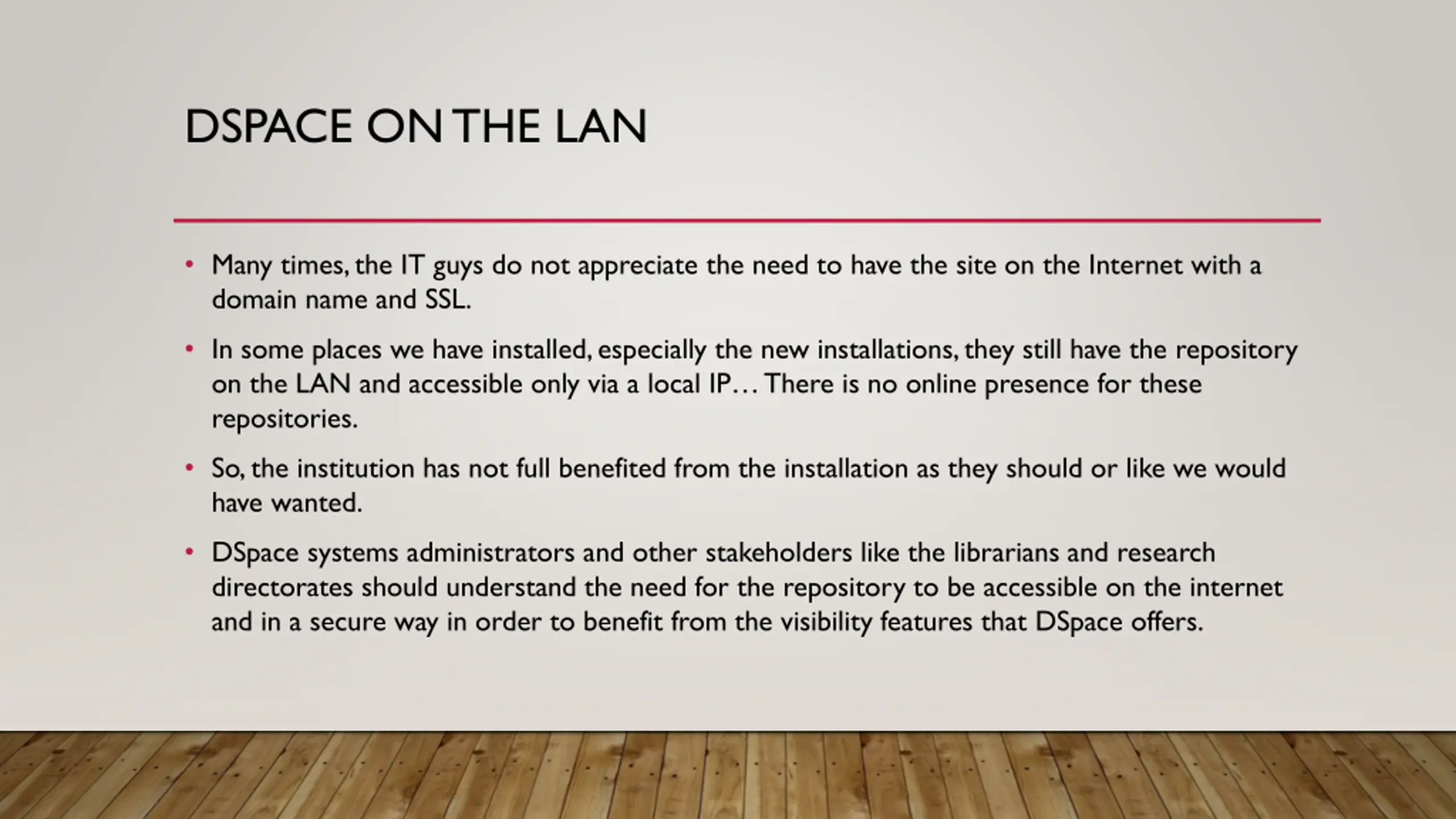 DSPACE ON THE LAN Many times, the IT guys do not appreciate the need to have the site on the Internet with a domain name and SSL. In some places we have installed, especially the new installations, they still have the repository on the LAN and accessible only via a local IP There is no online presence for these repositories. So, the institution has not full benefited from the installation as they should or like we would have wanted. DSpace systems administrators and other stakeholders like the librarians and research directorates should understand the need for the repository to be accessible on the internet and in a secure way in order to benefit from the visibility features that DSpace offers.