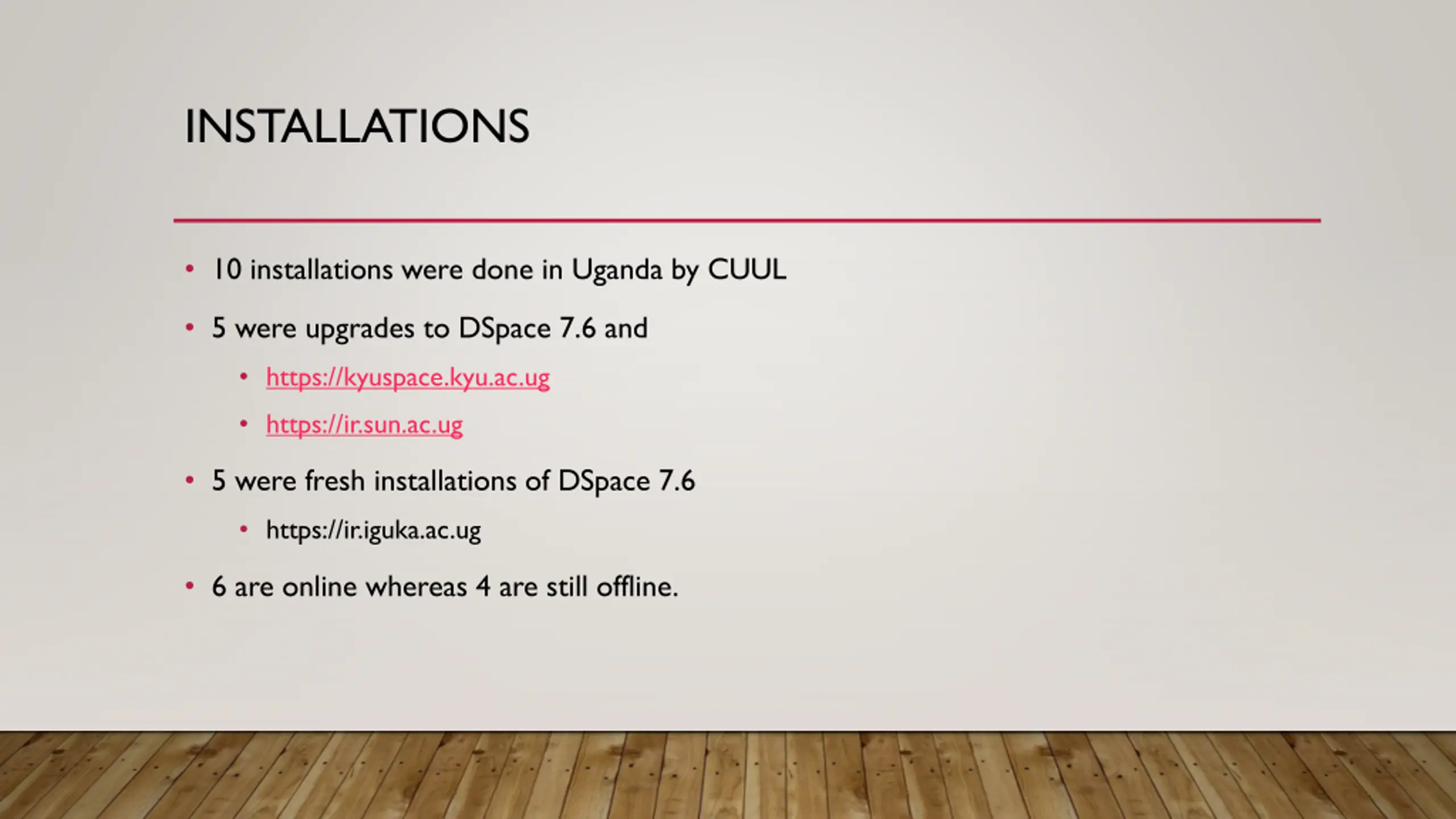 INSTALLATIONS 10 installations were done in Uganda by CUUL 5 were upgrades to DSpace 7.6 and https://kyuspace.kyu.ac.ug https://ir.sun.ac.ug 5 were fresh installations of DSpace 7.6 https://ir.iguka.ac.ug 6 are online whereas 4 are still offline.