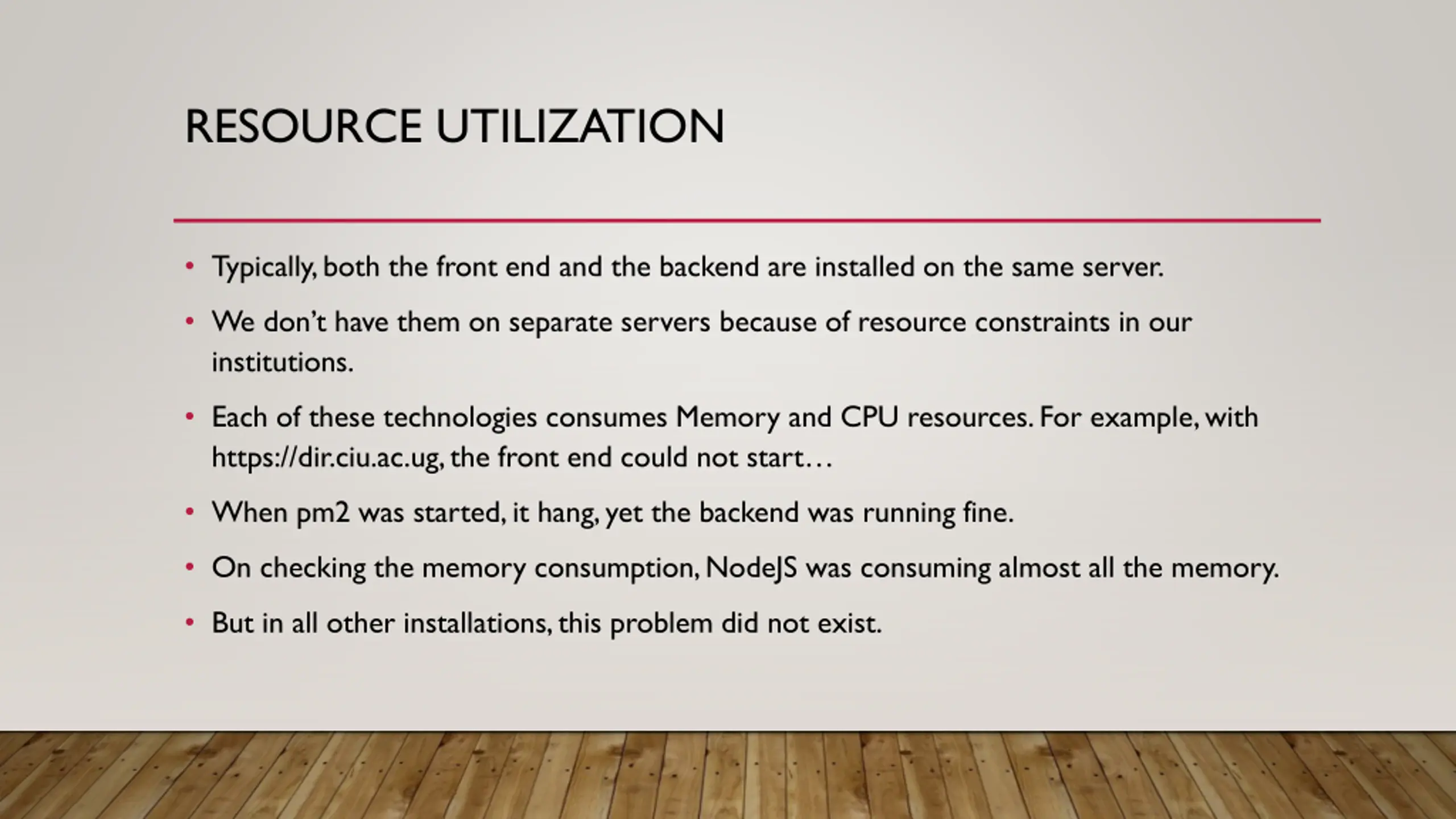 RESOURCE UTILIZATION Typically, both the front end and the backend are installed on the same server. We don t have them on separate servers because of resource constraints in our institutions. Each of these technologies consumes Memory and CPU resources. For example, with https://dir.ciu.ac.ug, the front end could not start When pm2 was started, it hang, yet the backend was running fine. On checking the memory consumption, NodeJS was consuming almost all the memory. But in all other installations, this problem did not exist.