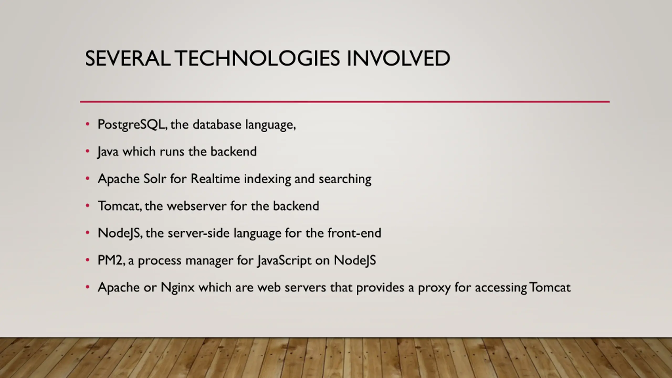 SEVERAL TECHNOLOGIES INVOLVED PostgreSQL, the database language, Java which runs the backend Apache Solr for Realtime indexing and searching Tomcat, the webserver for the backend NodeJS, the server-side language for the front-end PM2, a process manager for JavaScript on NodeJS Apache or Nginx which are web servers that provides a proxy for accessing Tomcat