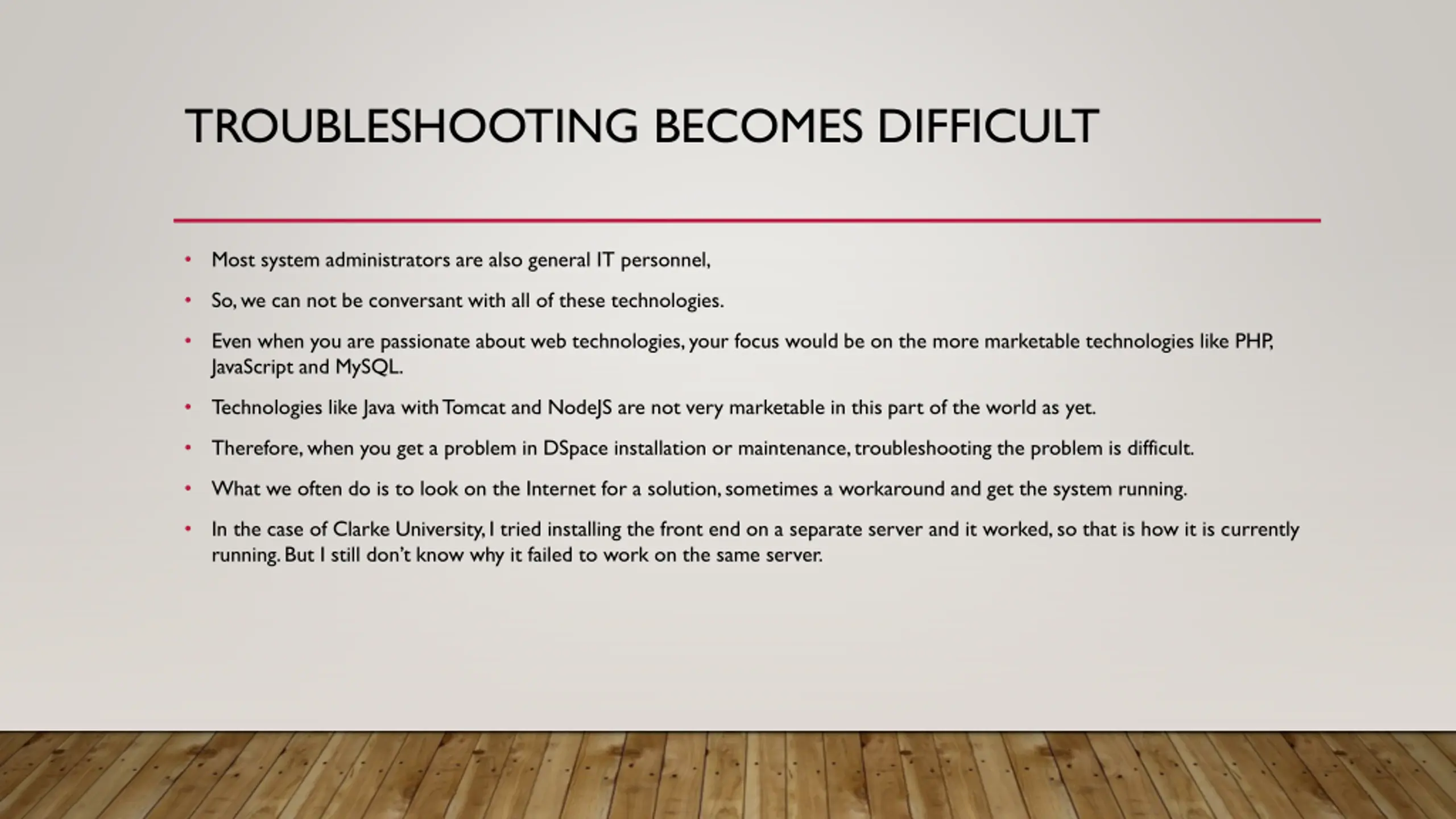 TROUBLESHOOTING BECOMES DIFFICULT Most system administrators are also general IT personnel, So, we can not be conversant with all of these technologies. Even when you are passionate about web technologies, your focus would be on the more marketable technologies like PHP, JavaScript and MySQL. Technologies like Java with Tomcat and NodeJS are not very marketable in this part of the world as yet. Therefore, when you get a problem in DSpace installation or maintenance, troubleshooting the problem is difficult. What we often do is to look on the Internet for a solution, sometimes a workaround and get the system running. In the case of Clarke University, I tried installing the front end on a separate server and it worked, so that is how it is currently running. But I still don t know why it failed to work on the same server.