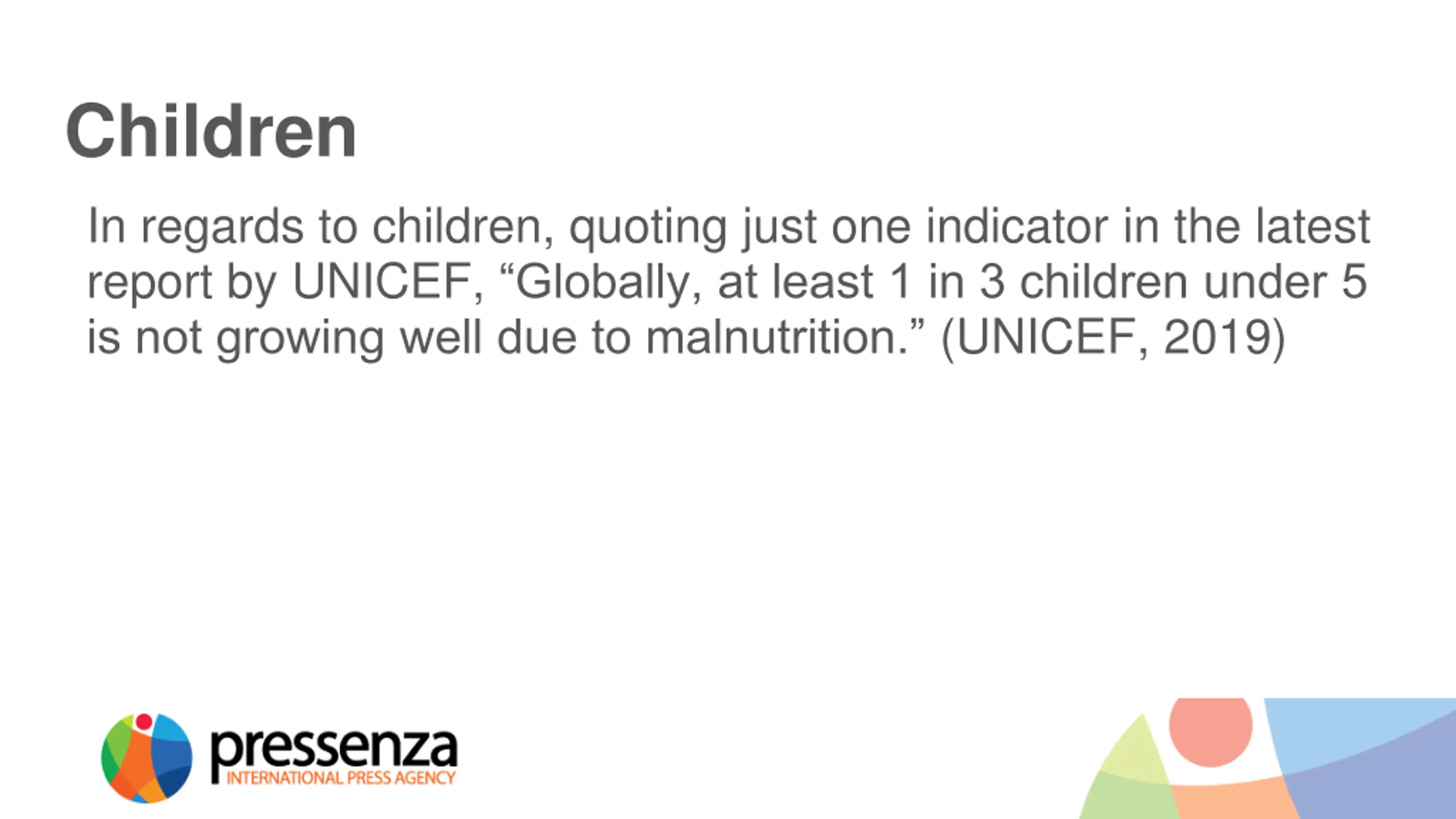 Children In regards to children, quoting just one indicator in the latest report by UNICEF, Globally, at least 1 in 3 children under 5 is not growing well due to malnutrition. (UNICEF, 2019)