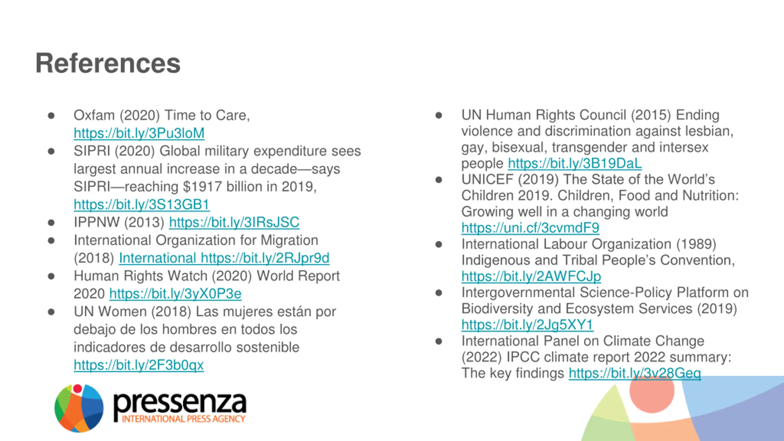 References UN Human Rights Council (2015) Ending violence and discrimination against lesbian, gay, bisexual, transgender and intersex people https://bit.ly/3B19DaL UNICEF (2019) The State of the World s Children 2019. Children, Food and Nutrition: Growing well in a changing world https://uni.cf/3cvmdF9 International Labour Organization (1989) Indigenous and Tribal People s Convention, https://bit.ly/2AWFCJp Intergovernmental Science-Policy Platform on Biodiversity and Ecosystem Services (2019) https://bit.ly/2Jg5XY1 International Panel on Climate Change (2022) IPCC climate report 2022 summary: The key findings https://bit.ly/3v28Geq Oxfam (2020) Time to Care, https://bit.ly/3Pu3loM SIPRI (2020) Global military expenditure sees largest annual increase in a decade says SIPRI reaching $1917 billion in 2019, https://bit.ly/3S13GB1 IPPNW (2013) https://bit.ly/3IRsJSC International Organization for Migration (2018) International https://bit.ly/2RJpr9d Human Rights Watch (2020) World Report 2020 https://bit.ly/3yX0P3e UN Women (2018) Las mujeres est n por debajo de los hombres en todos los indicadores de desarrollo sostenible https://bit.ly/2F3b0qx