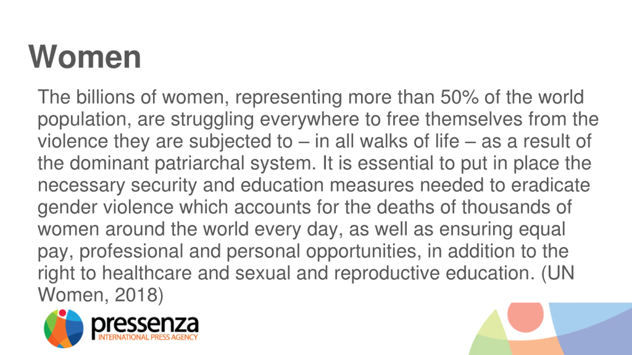 Women The billions of women, representing more than 50% of the world population, are struggling everywhere to free themselves from the violence they are subjected to in all walks of life as a result of the dominant patriarchal system. It is essential to put in place the necessary security and education measures needed to eradicate gender violence which accounts for the deaths of thousands of women around the world every day, as well as ensuring equal pay, professional and personal opportunities, in addition to the right to healthcare and sexual and reproductive education. (UN Women, 2018)