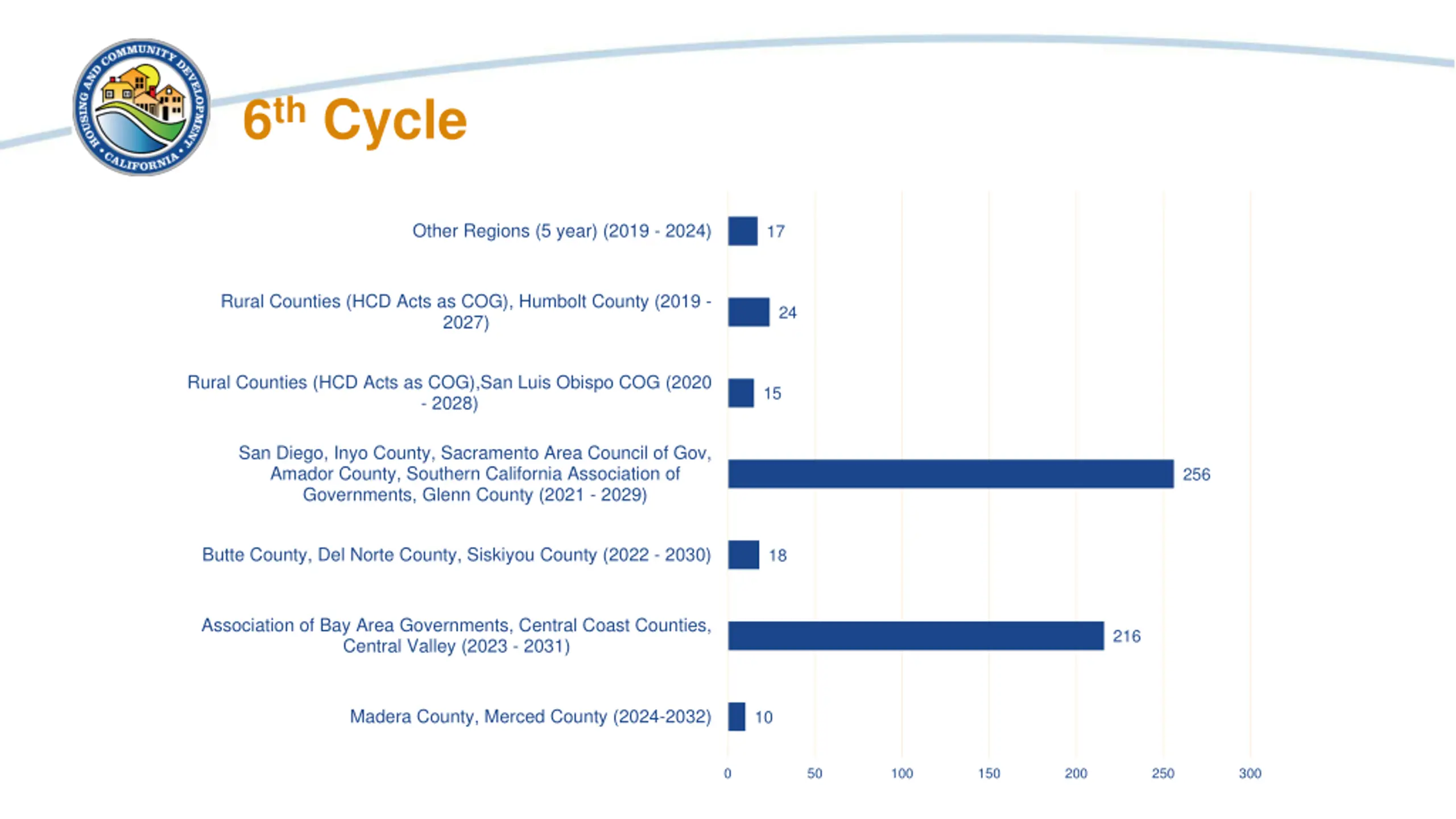 6thCycle Other Regions (5 year) (2019 - 2024) 17 Rural Counties (HCD Acts as COG), Humbolt County (2019 - 2027) 24 Rural Counties (HCD Acts as COG),San Luis Obispo COG (2020 - 2028) 15 San Diego, Inyo County, Sacramento Area Council of Gov, Amador County, Southern California Association of Governments, Glenn County (2021 - 2029) 256 Butte County, Del Norte County, Siskiyou County (2022 - 2030) 18 Association of Bay Area Governments, Central Coast Counties, Central Valley (2023 - 2031) 216 Madera County, Merced County (2024-2032) 10 0 50 100 150 200 250 300