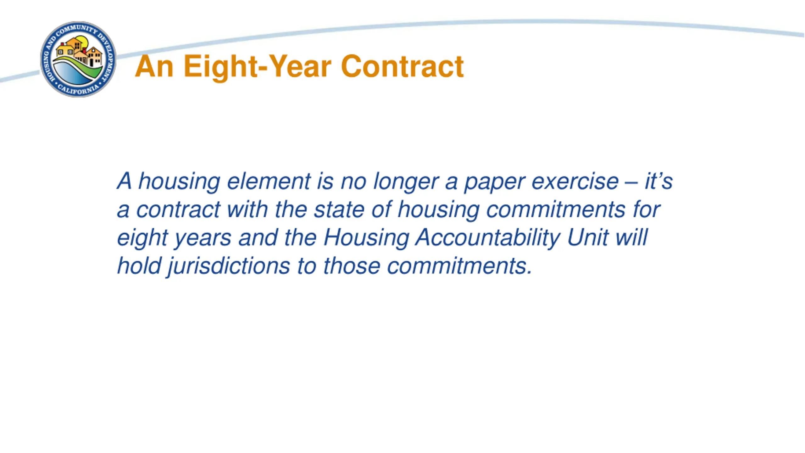 An Eight-Year Contract A housing element is no longer a paper exercise it s a contract with the state of housing commitments for eight years and the Housing Accountability Unit will hold jurisdictions to those commitments.
