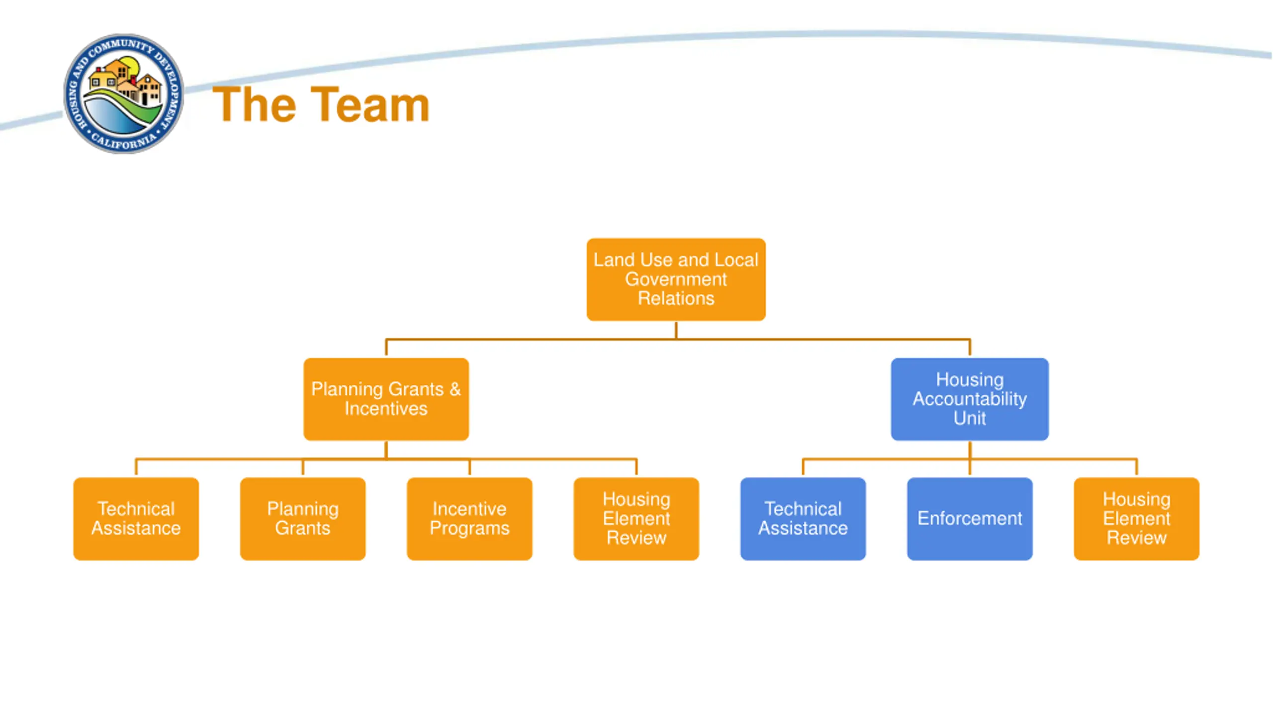 The Team Land Use and Local Government Relations Housing Accountability Unit Planning Grants & Incentives Housing Element Review Housing Element Review Technical Assistance Planning Grants Incentive Programs Technical Assistance Enforcement