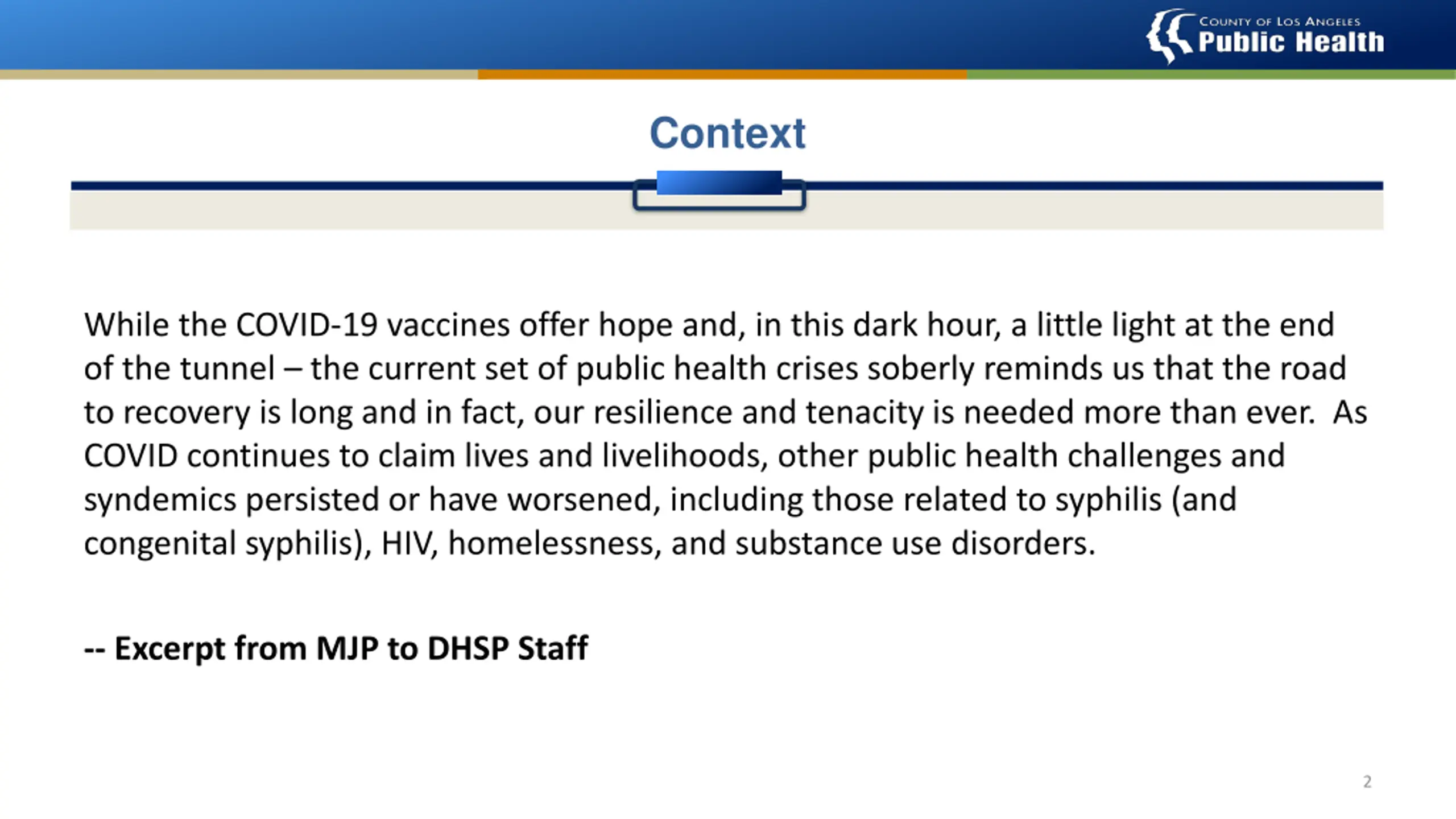 Context While the COVID-19 vaccines offer hope and, in this dark hour, a little light at the end of the tunnel the current set of public health crises soberly reminds us that the road to recovery is long and in fact, our resilience and tenacity is needed more than ever. As COVID continues to claim lives and livelihoods, other public health challenges and syndemics persisted or have worsened, including those related to syphilis (and congenital syphilis), HIV, homelessness, and substance use disorders. -- Excerpt from MJP to DHSP Staff 2