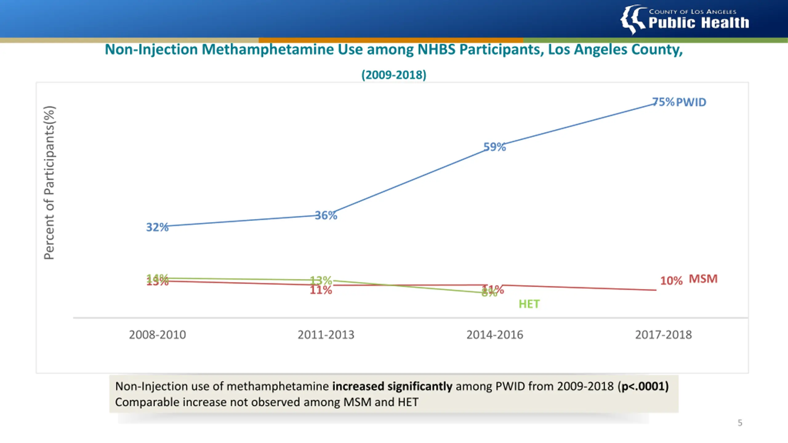 Non-Injection Methamphetamine Use among NHBS Participants, Los Angeles County, (2009-2018) 75% PWID Percent of Participants(%) 59% 36% 32% 13% 14% MSM 13% 10% 11% 8% 11% HET 2008-2010 2011-2013 2014-2016 2017-2018 Non-Injection use of methamphetamine increased significantly among PWID from 2009-2018 (p<.0001) Comparable increase not observed among MSM and HET 5