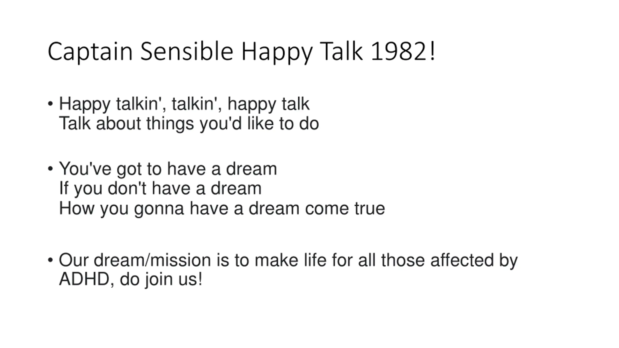 Captain Sensible Happy Talk 1982! Happy talkin', talkin', happy talk Talk about things you'd like to do You've got to have a dream If you don't have a dream How you gonna have a dream come true Our dream/mission is to make life for all those affected by ADHD, do join us!