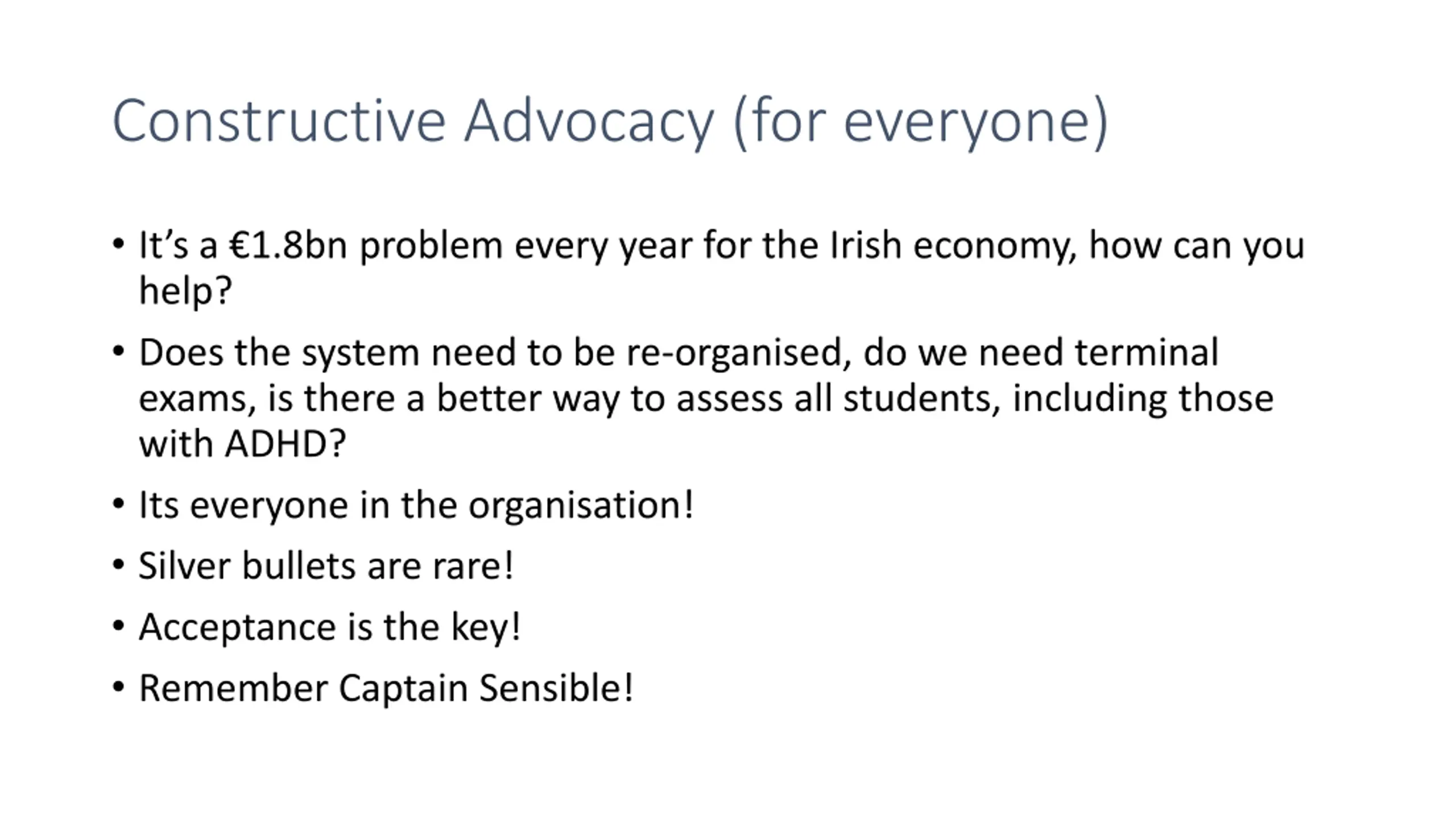 Constructive Advocacy (for everyone) It s a 1.8bn problem every year for the Irish economy, how can you help? Does the system need to be re-organised, do we need terminal exams, is there a better way to assess all students, including those with ADHD? Its everyone in the organisation! Silver bullets are rare! Acceptance is the key! Remember Captain Sensible!