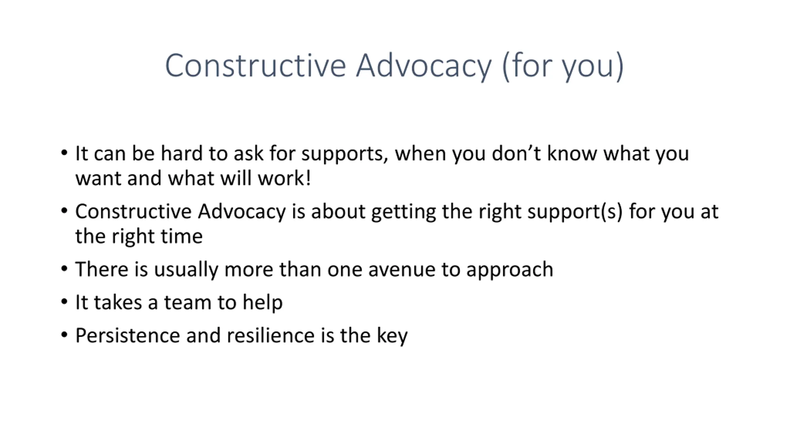 Constructive Advocacy (for you) It can be hard to ask for supports, when you don t know what you want and what will work! Constructive Advocacy is about getting the right support(s) for you at the right time There is usually more than one avenue to approach It takes a team to help Persistence and resilience is the key