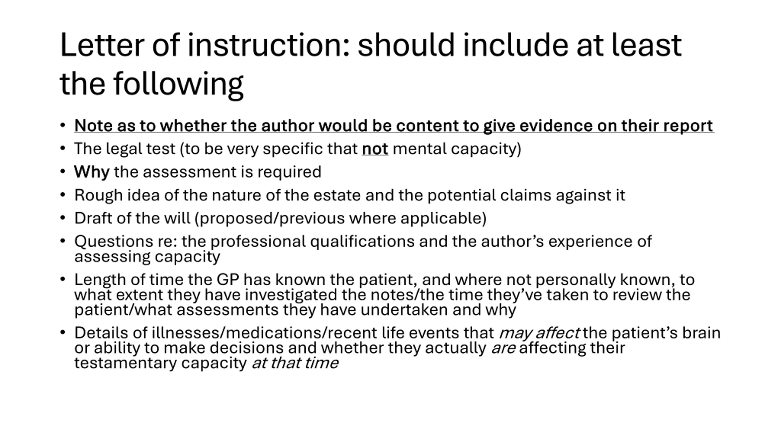 Letter of instruction: should include at least the following Note as to whether the author would be content to give evidence on their report Note as to whether the author would be content to give evidence on their report The legal test (to be very specific that not not mental capacity) Why Why the assessment is required Rough idea of the nature of the estate and the potential claims against it Draft of the will (proposed/previous where applicable) Questions re: the professional qualifications and the author s experience of assessing capacity Length of time the GP has known the patient, and where not personally known, to what extent they have investigated the notes/the time they ve taken to review the patient/what assessments they have undertaken and why Details of illnesses/medications/recent life events that may affect the patient s brain or ability to make decisions and whether they actually are affecting their testamentary capacity at that time