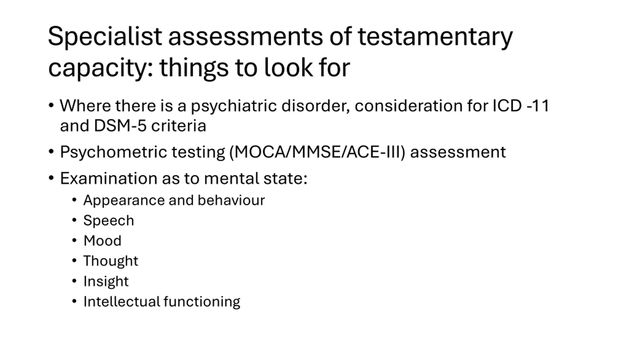 Specialist assessments of testamentary capacity: things to look for Where there is a psychiatric disorder, consideration for ICD -11 and DSM-5 criteria Psychometric testing (MOCA/MMSE/ACE-III) assessment Examination as to mental state: Appearance and behaviour Speech Mood Thought Insight Intellectual functioning