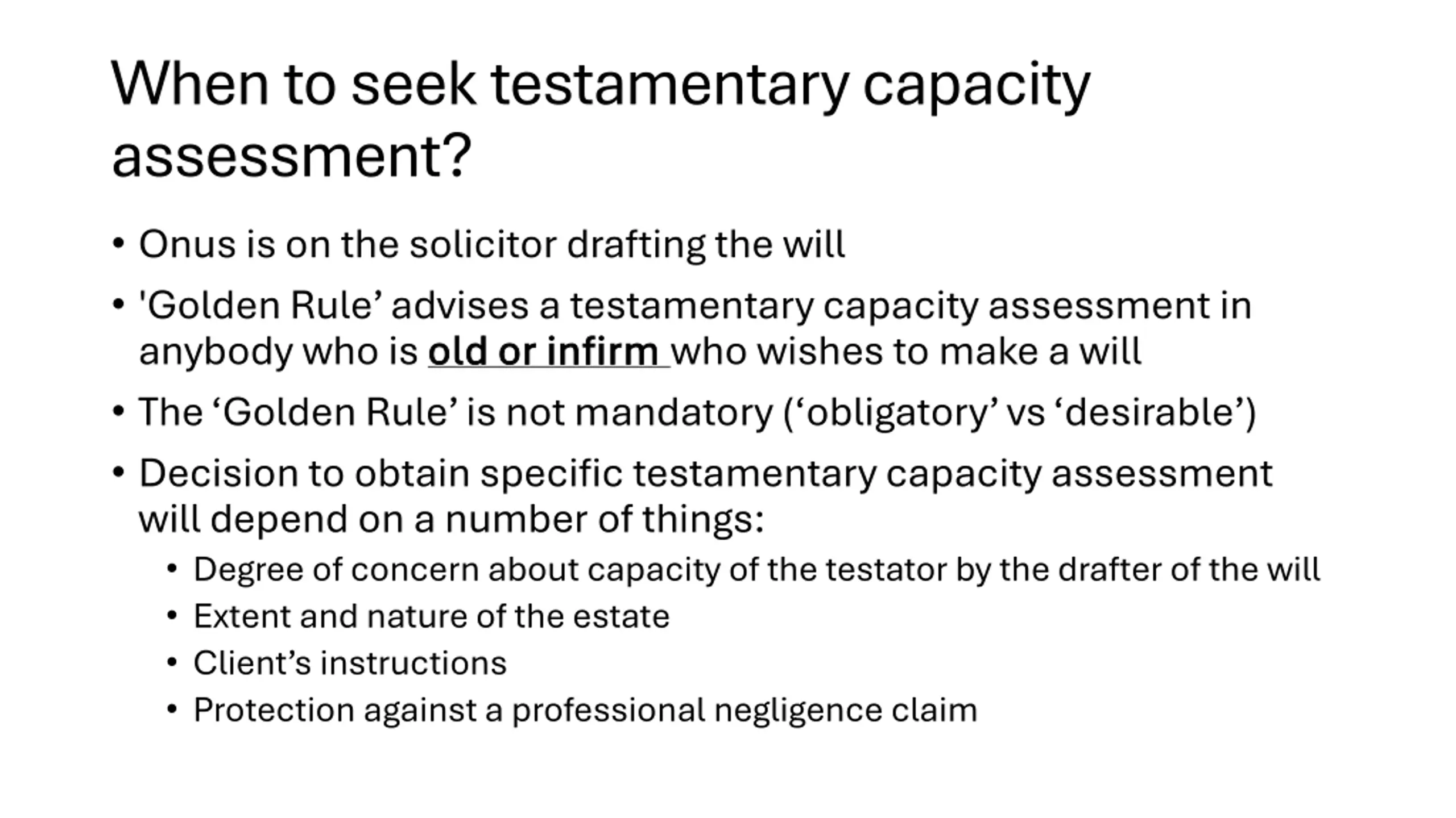 When to seek testamentary capacity assessment? Onus is on the solicitor drafting the will 'Golden Rule advises a testamentary capacity assessment in anybody who is old or infirm old or infirm who wishes to make a will The Golden Rule is not mandatory ( obligatory vs desirable ) Decision to obtain specific testamentary capacity assessment will depend on a number of things: Degree of concern about capacity of the testator by the drafter of the will Extent and nature of the estate Client s instructions Protection against a professional negligence claim