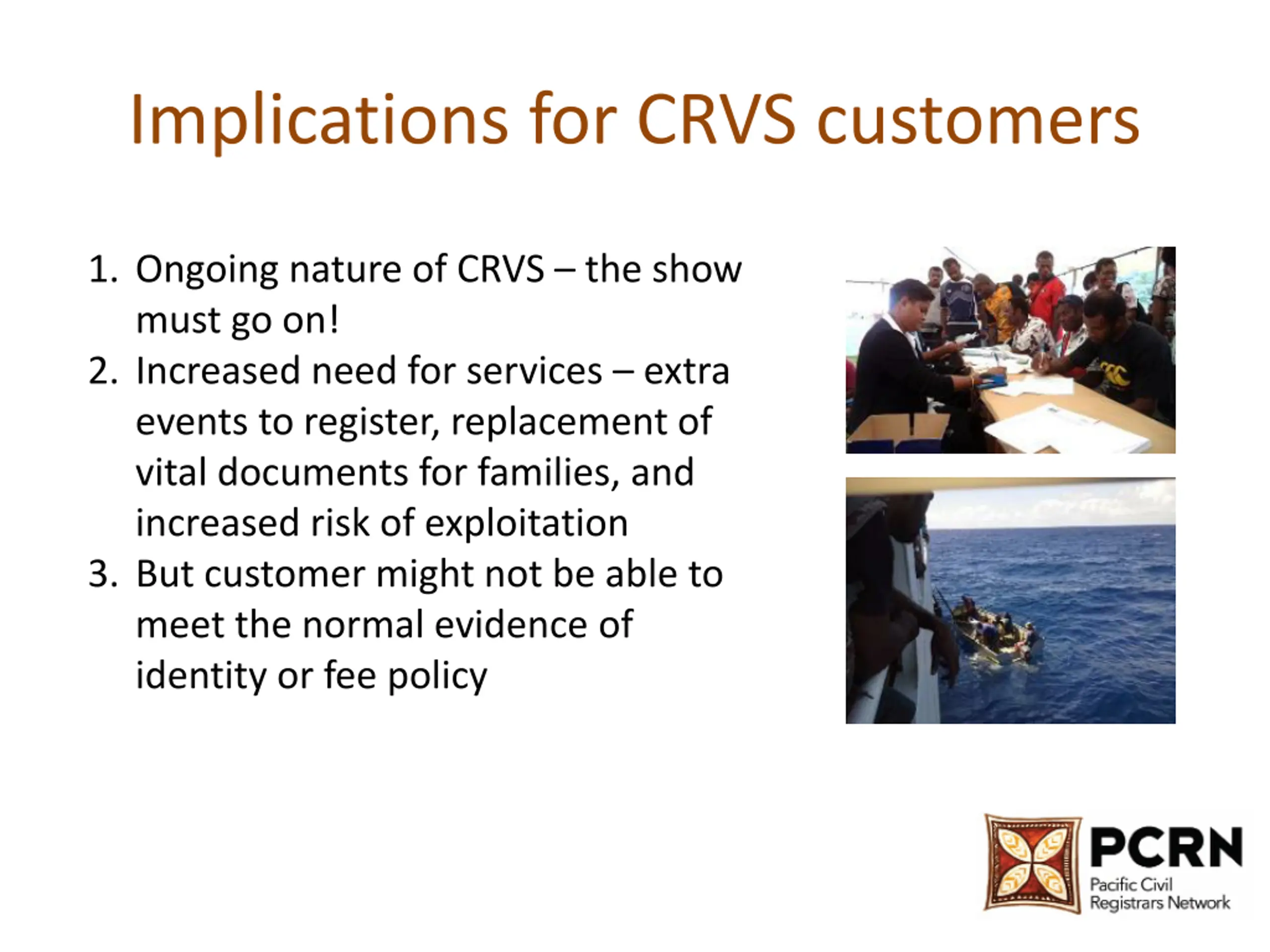 Implications for CRVS customers 1. Ongoing nature of CRVS the show must go on! 2. Increased need for services extra events to register, replacement of vital documents for families, and increased risk of exploitation 3. But customer might not be able to meet the normal evidence of identity or fee policy