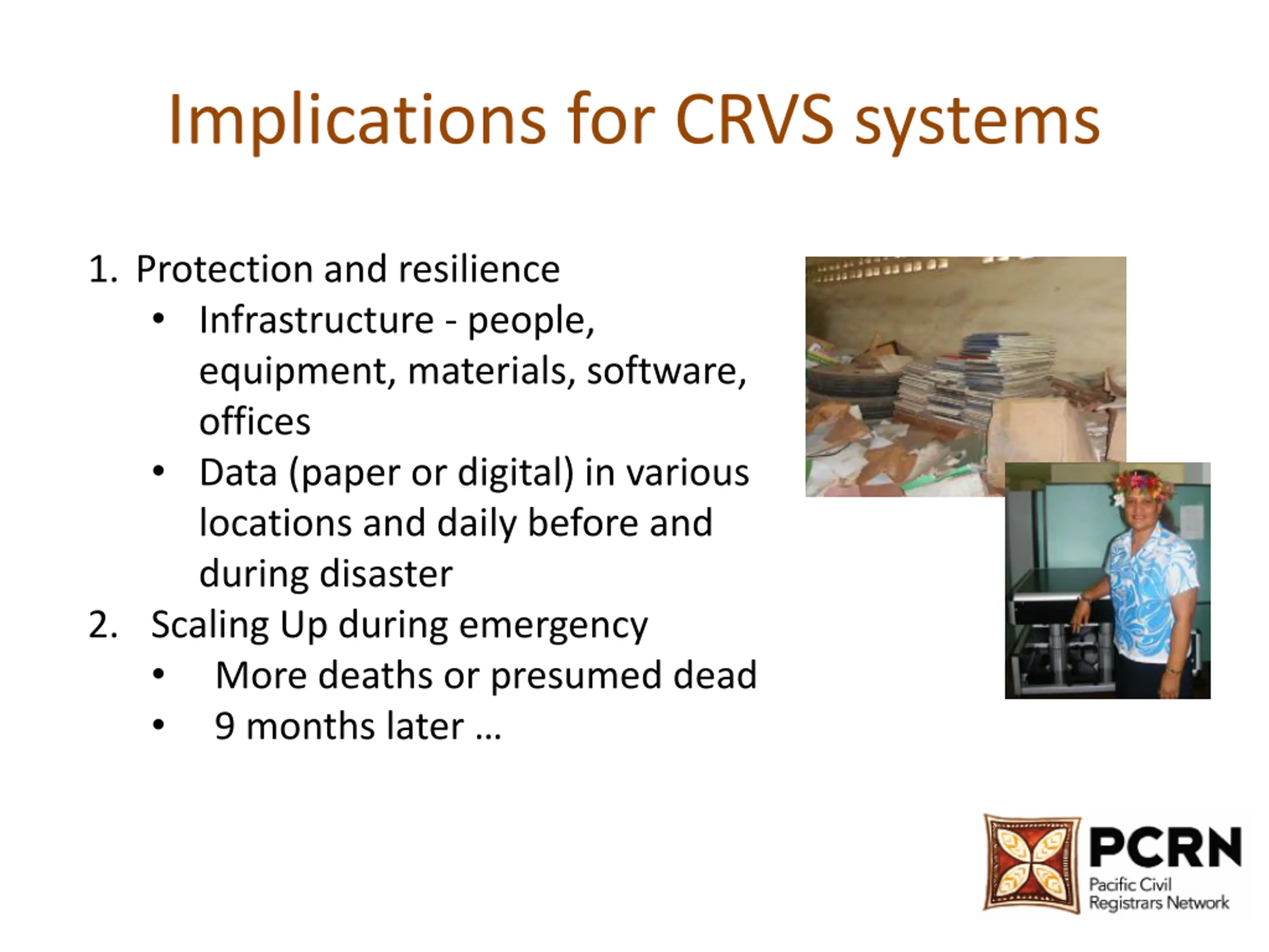 Implications for CRVS systems 1. Protection and resilience Infrastructure - people, equipment, materials, software, offices Data (paper or digital) in various locations and daily before and during disaster 2. Scaling Up during emergency More deaths or presumed dead 9 months later