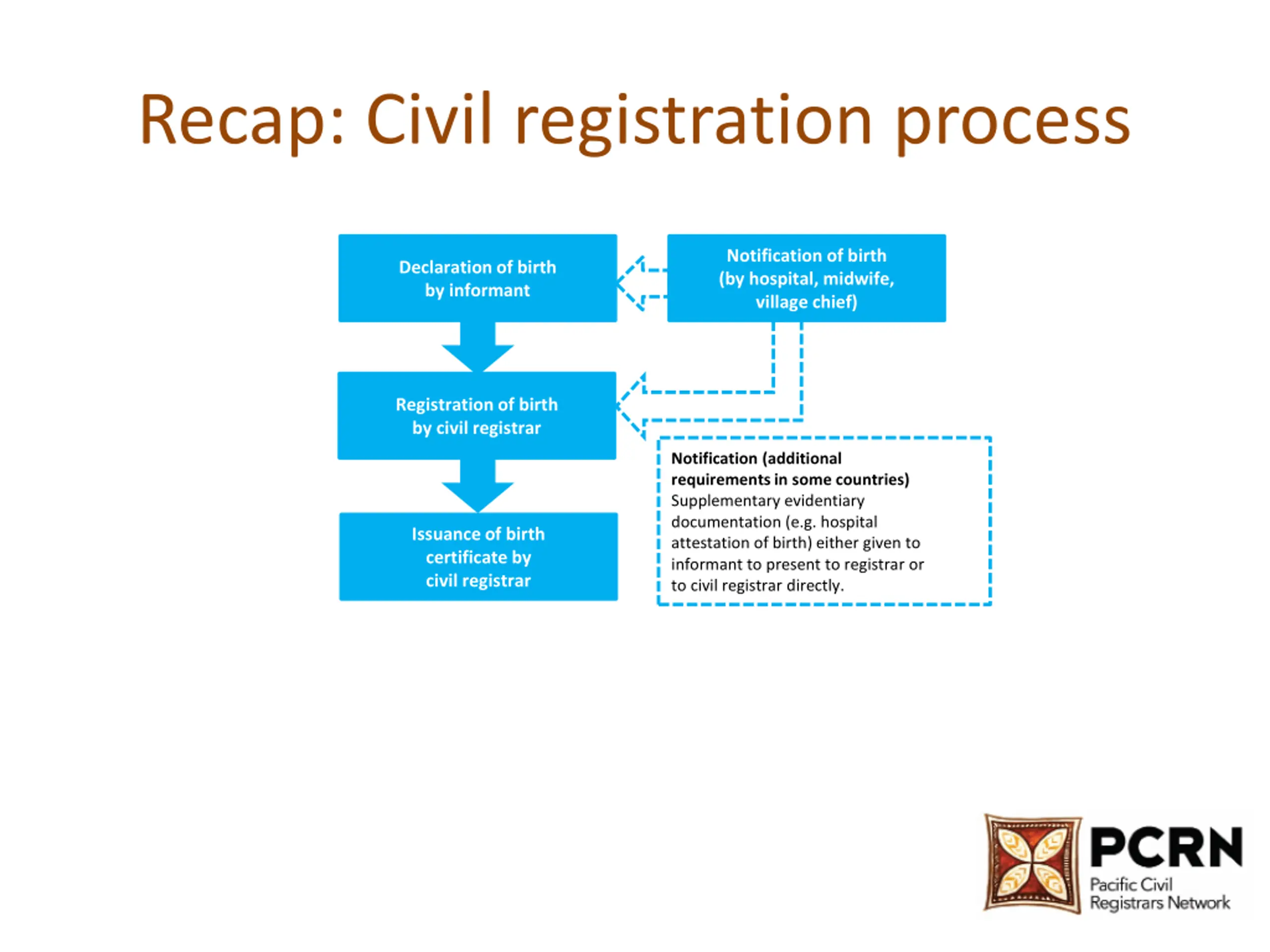 Recap: Civil registration process Notification of birth (by hospital, midwife, village chief) Declaration of birth by informant Registration of birth by civil registrar Notification (additional requirements in some countries) Supplementary evidentiary documentation (e.g. hospital attestation of birth) either given to informant to present to registrar or to civil registrar directly. Issuance of birth certificate by civil registrar