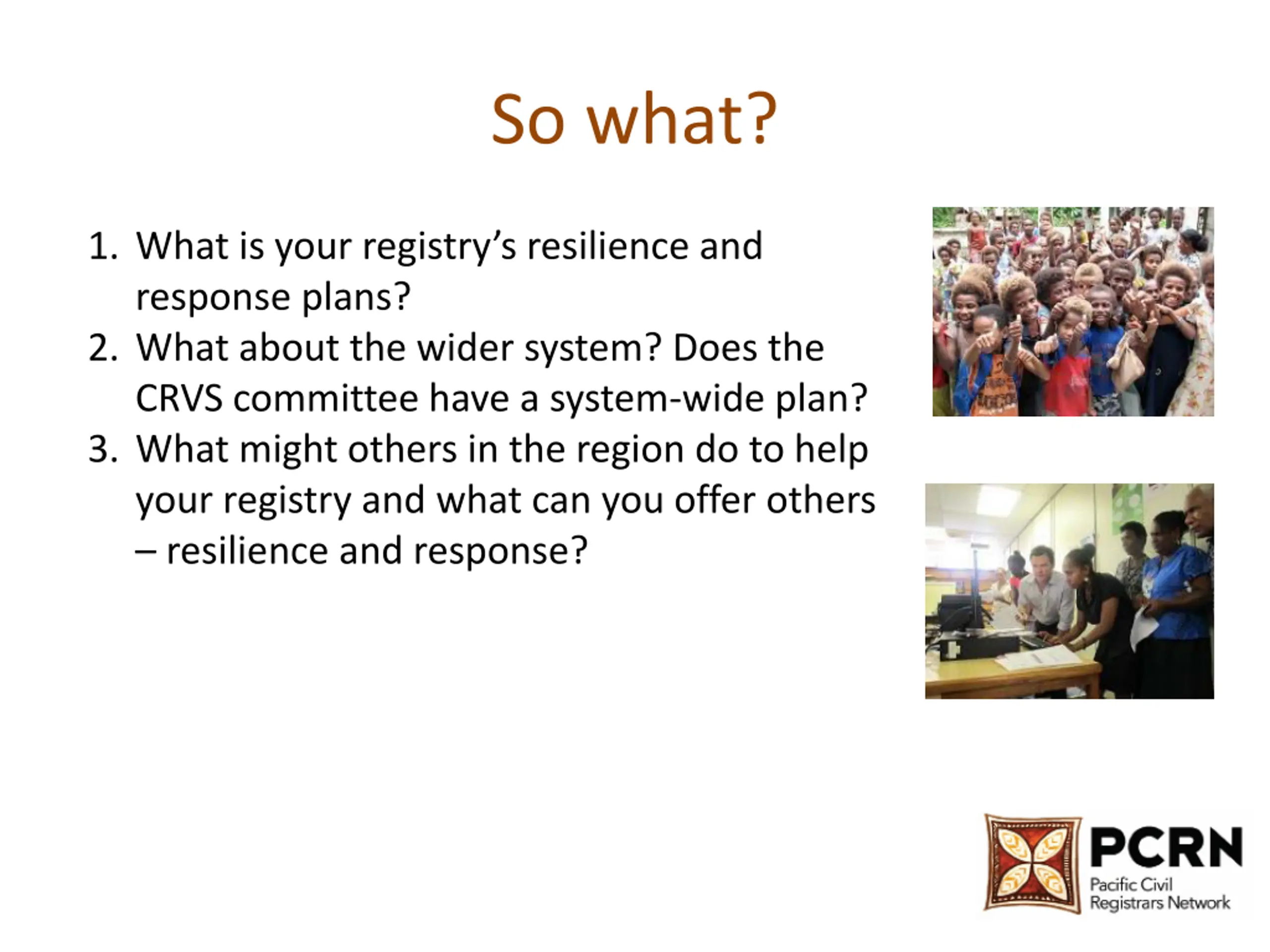 So what? 1. What is your registry s resilience and response plans? 2. What about the wider system? Does the CRVS committee have a system-wide plan? 3. What might others in the region do to help your registry and what can you offer others resilience and response?