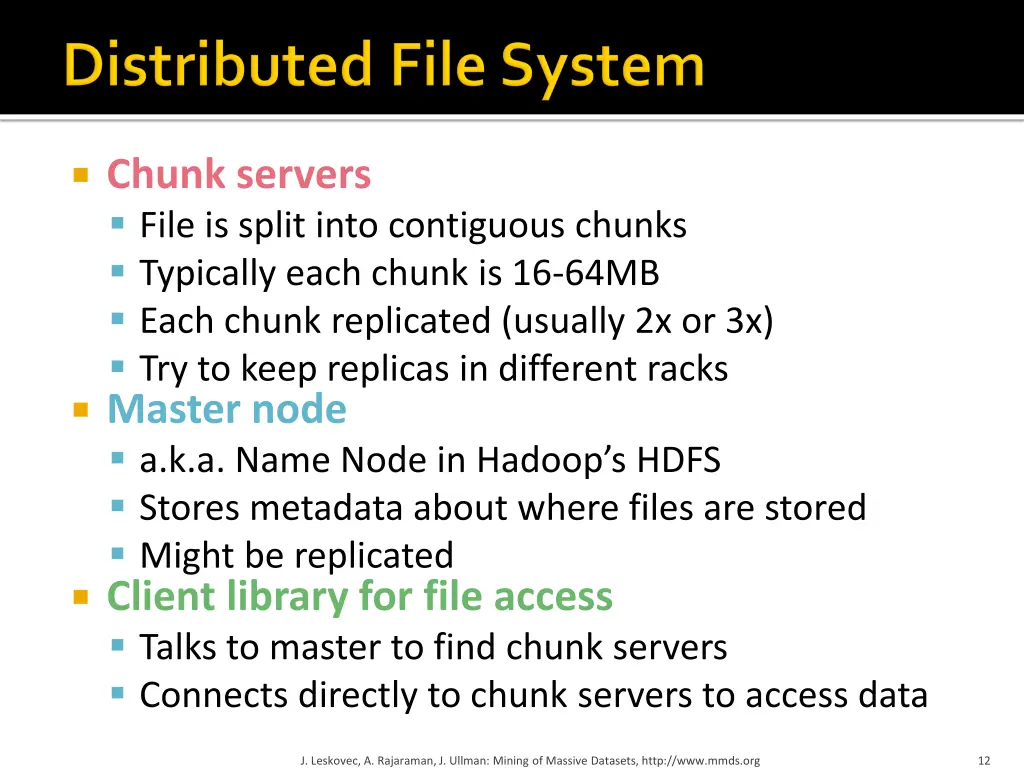 Chunk servers File is split into contiguous chunks Typically each chunk is 16-64MB Each chunk replicated (usually 2x or 3x) Try to keep replicas in different racks Master node a.k.a. Name Node in Hadoop s HDFS Stores metadata about where files are stored Might be replicated Client library for file access Talks to master to find chunk servers Connects directly to chunk servers to access data J. Leskovec, A. Rajaraman, J. Ullman: Mining of Massive Datasets, http://www.mmds.org 12