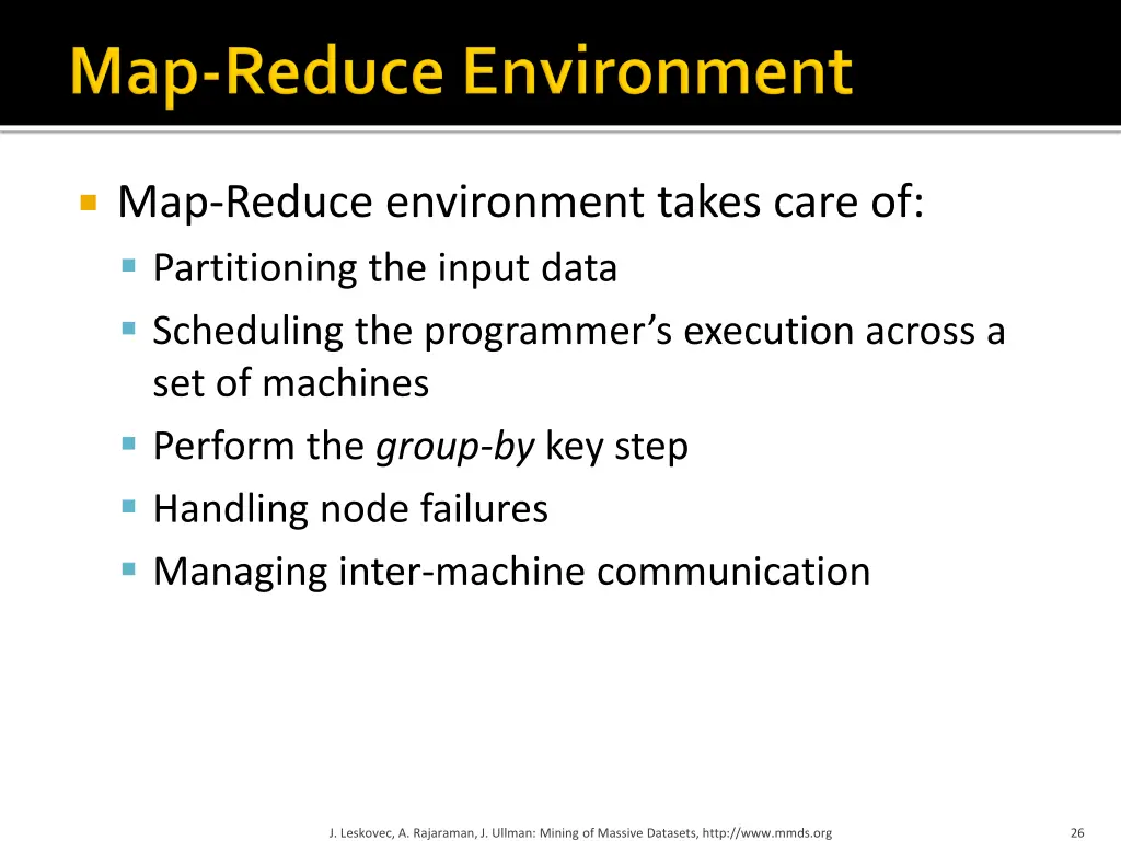 Map-Reduce environment takes care of: Partitioning the input data Scheduling the programmer s execution across a set of machines Perform the group-by key step Handling node failures Managing inter-machine communication J. Leskovec, A. Rajaraman, J. Ullman: Mining of Massive Datasets, http://www.mmds.org 26