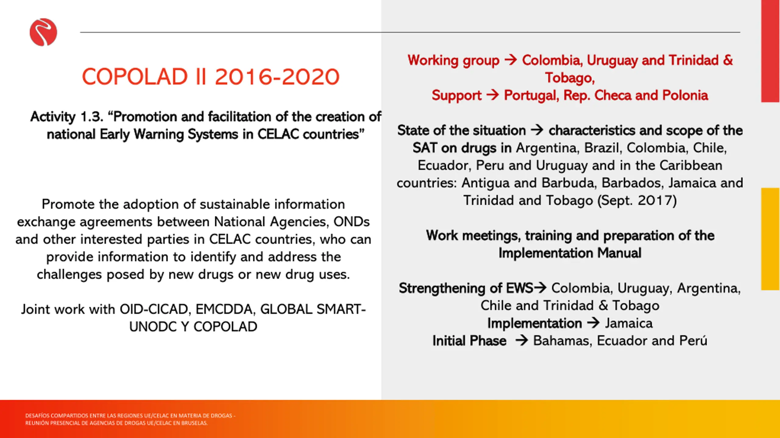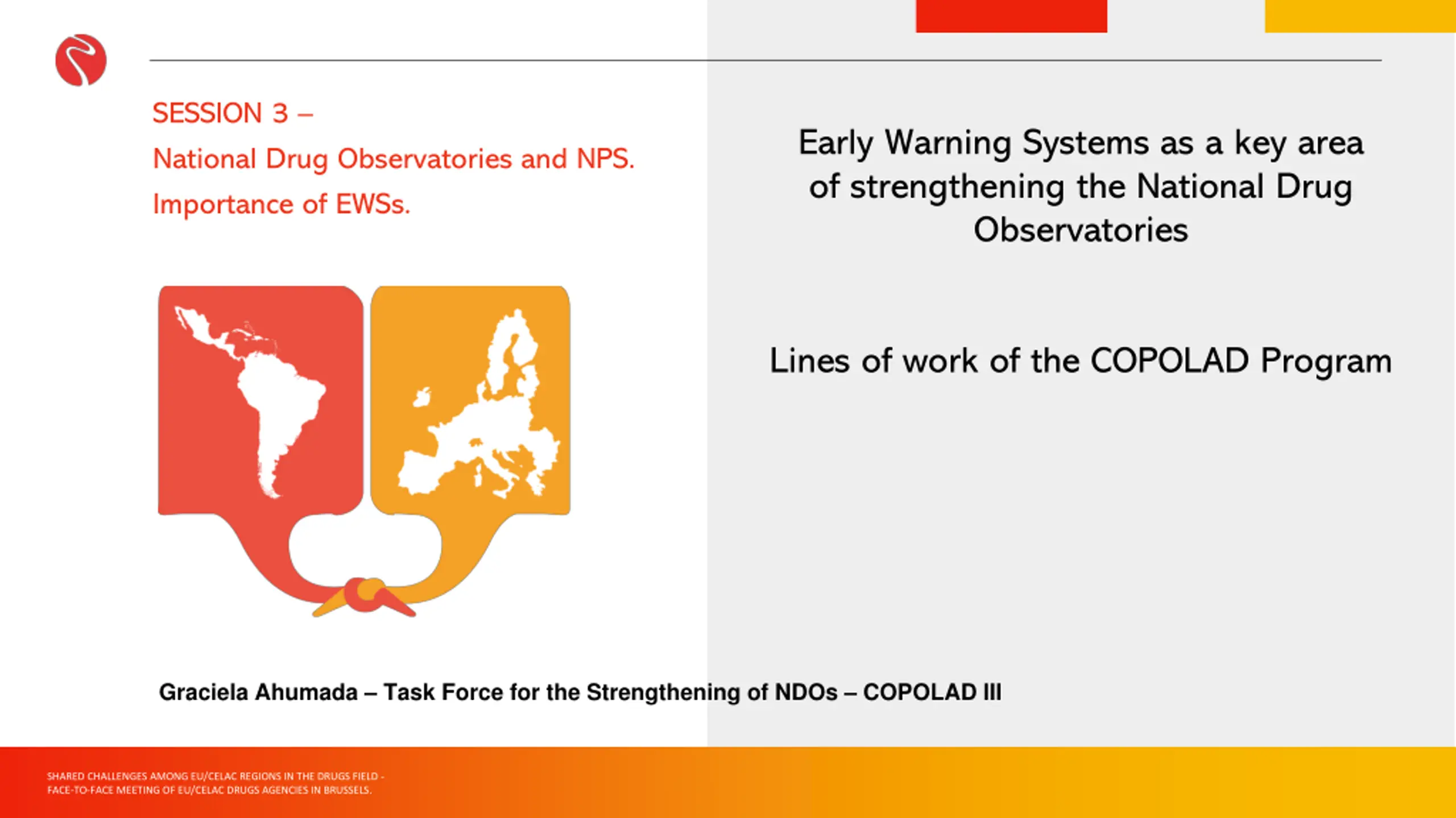 SESSION 3 National Drug Observatories and NPS. Importance of EWSs. Early Warning Systems as a key area of strengthening the National Drug Observatories Lines of work of the COPOLAD Program Graciela Ahumada Task Force for the Strengthening of NDOs COPOLAD III SHARED CHALLENGES AMONG EU/CELAC REGIONS IN THE DRUGS FIELD - FACE-TO-FACE MEETING OF EU/CELAC DRUGS AGENCIES IN BRUSSELS.