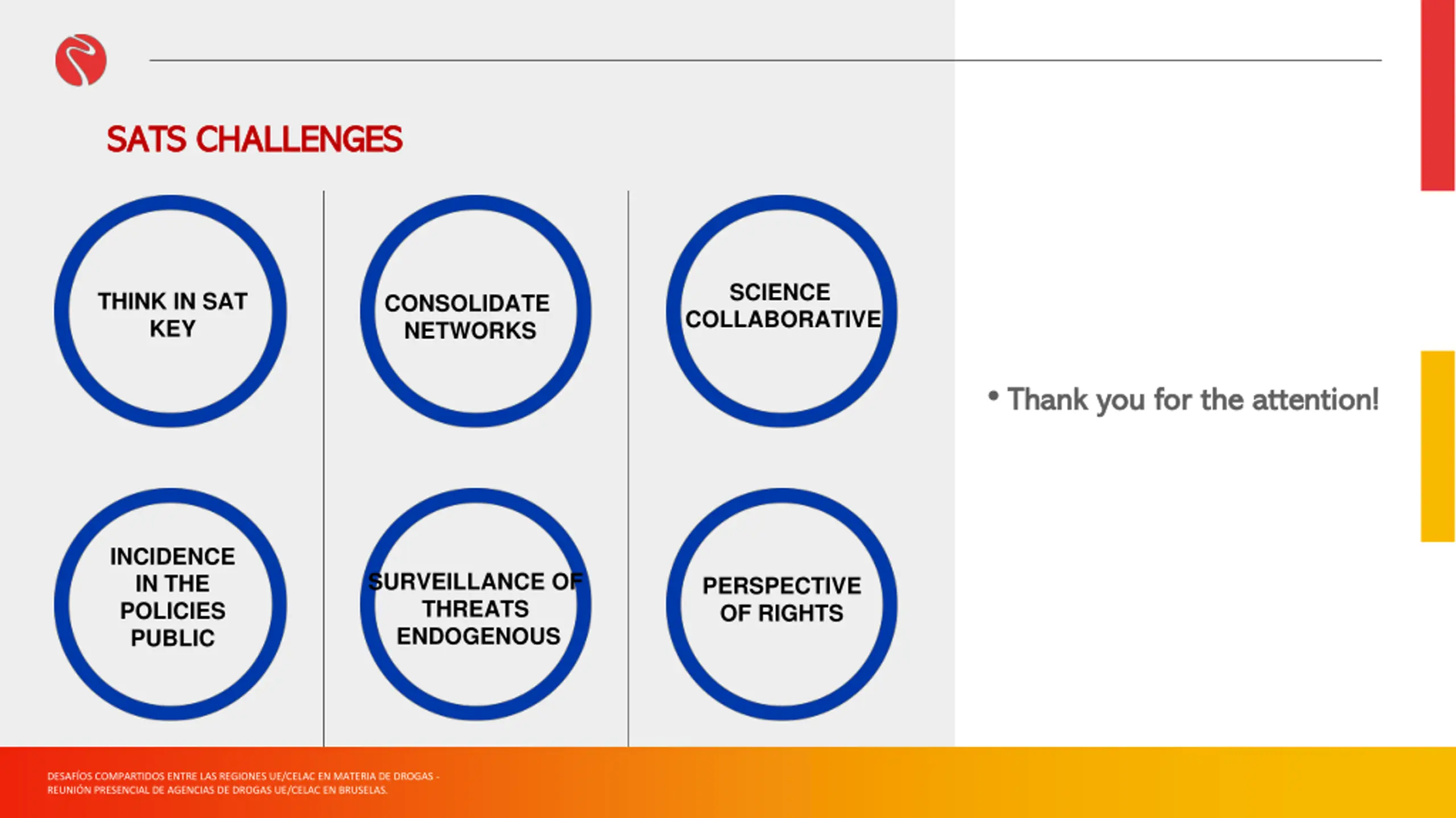 SATS CHALLENGES SATS CHALLENGES SCIENCE COLLABORATIVE THINK IN SAT KEY CONSOLIDATE NETWORKS Thank Thank you you for for the the attention attention! ! INCIDENCE IN THE POLICIES PUBLIC SURVEILLANCE OF THREATS ENDOGENOUS PERSPECTIVE OF RIGHTS DESAF OS COMPARTIDOS ENTRE LAS REGIONES UE/CELAC EN MATERIA DE DROGAS - REUNI N PRESENCIAL DE AGENCIAS DE DROGAS UE/CELAC EN BRUSELAS.